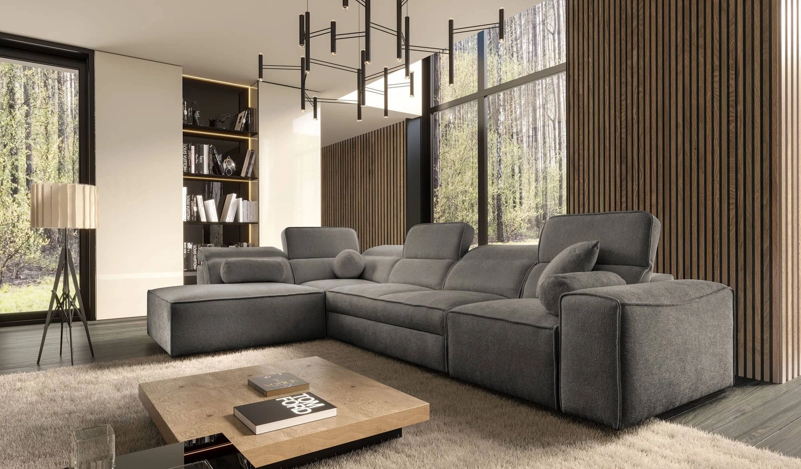 Narożnik z funkcją spania Viano XI szary lewostronny modny i stylowy narożnik z regulowanymi zagłówkami ozdobne poduszki