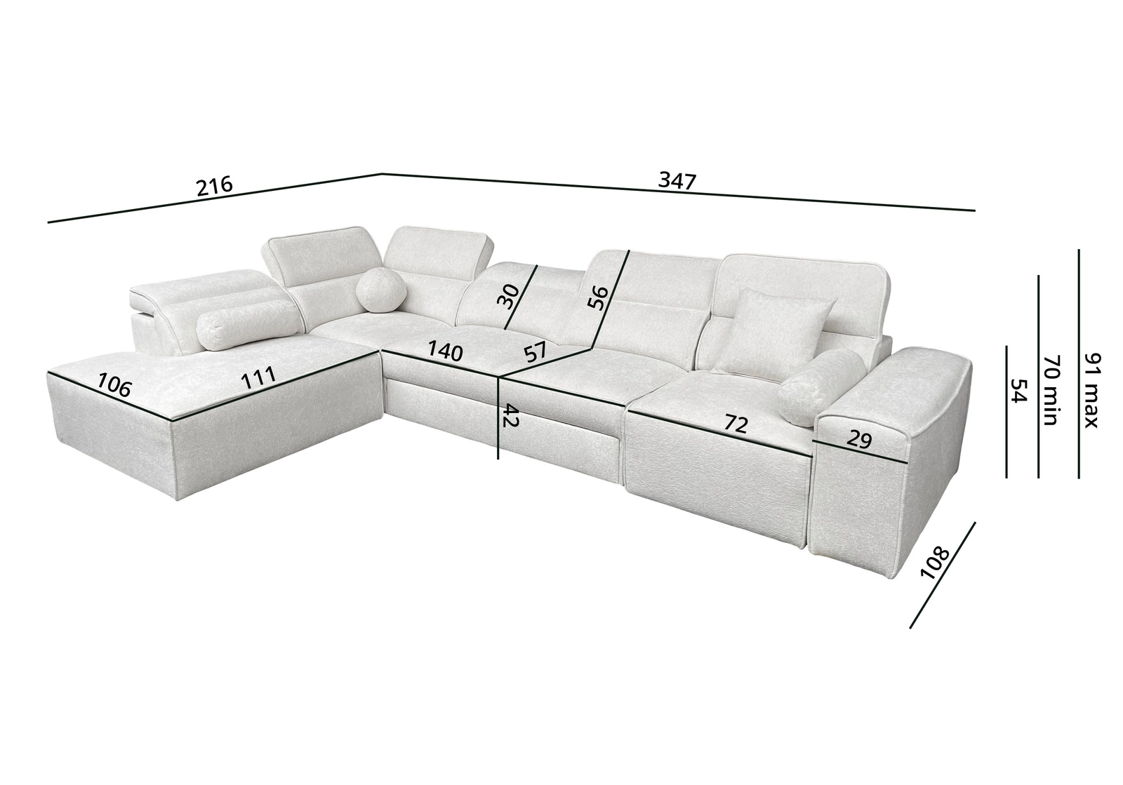 Wymiary mebla pozwolą na zagospodarowanie przestrzeni w przestronnym salonie lub pokoju dziennym. Szerokość narożnika 347 cm, wysokość 91 cm oraz głębokość 216 cm. Powierzchnia spania narożnika wynosi 127x198 cm. Wysokość siedziska mebla to 42 cm a wysokość oparcia wynosi 56 cm. Sprężyny faliste oraz pianka poliuretanowa T30 to materiał, z którego wykonane zostało siedzisko narożnika. Oparcie stałe z regulowanymi zagłówkami pozwoli na łatwe dostosowanie kąta nachylenia zagłówków do swoich preferencji oraz daje gwarancję wygodnego wypoczynku po długim dniu, które docenisz Ty, Twoi bliscy a także goście, którzy zasiądą na tym wyjątkowym narożniku.