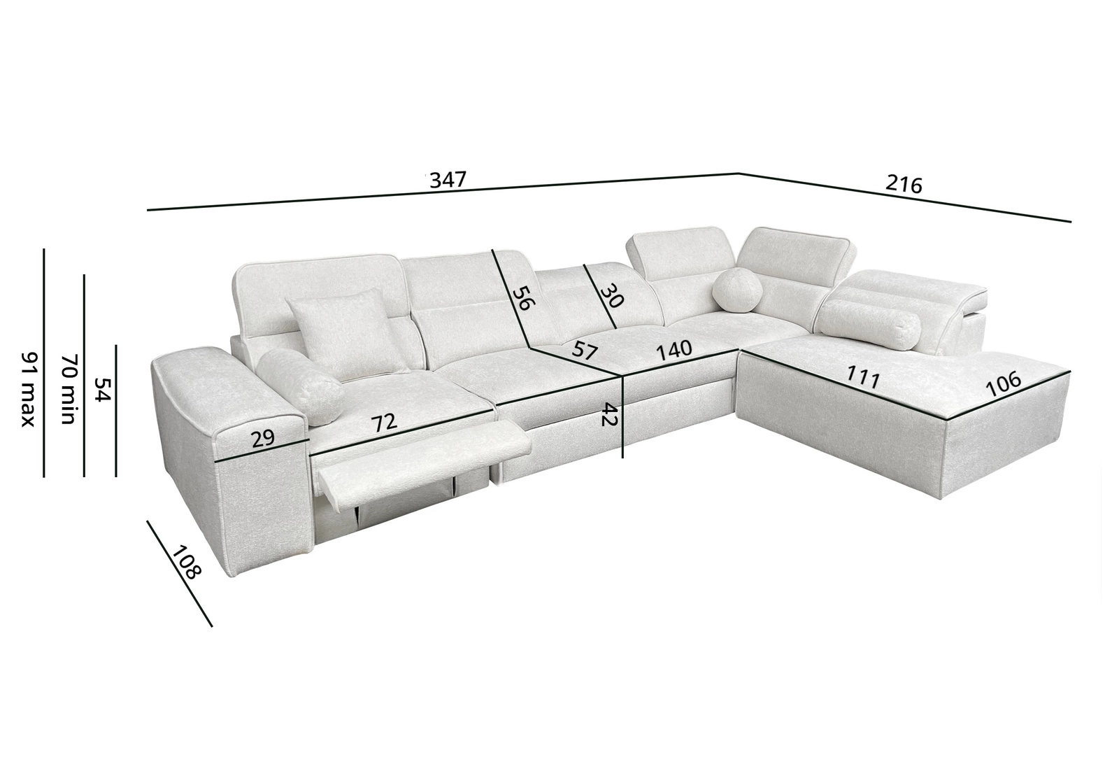 Wymiary mebla pozwolą na zagospodarowanie przestrzeni w przestronnym salonie lub pokoju dziennym. Szerokość narożnika 347 cm, wysokość 91 cm oraz głębokość 216 cm. Powierzchnia spania narożnika wynosi 127x198 cm. Wysokość siedziska mebla to 42 cm a wysokość oparcia wynosi 56 cm. Sprężyny faliste oraz pianka poliuretanowa T30 to materiał, z którego wykonane zostało siedzisko narożnika. Oparcie stałe z regulowanymi zagłówkami pozwoli na łatwe dostosowanie kąta nachylenia zagłówków do swoich preferencji oraz daje gwarancję wygodnego wypoczynku po długim dniu, które docenisz Ty, Twoi bliscy a także goście, którzy zasiądą na tym wyjątkowym narożniku.