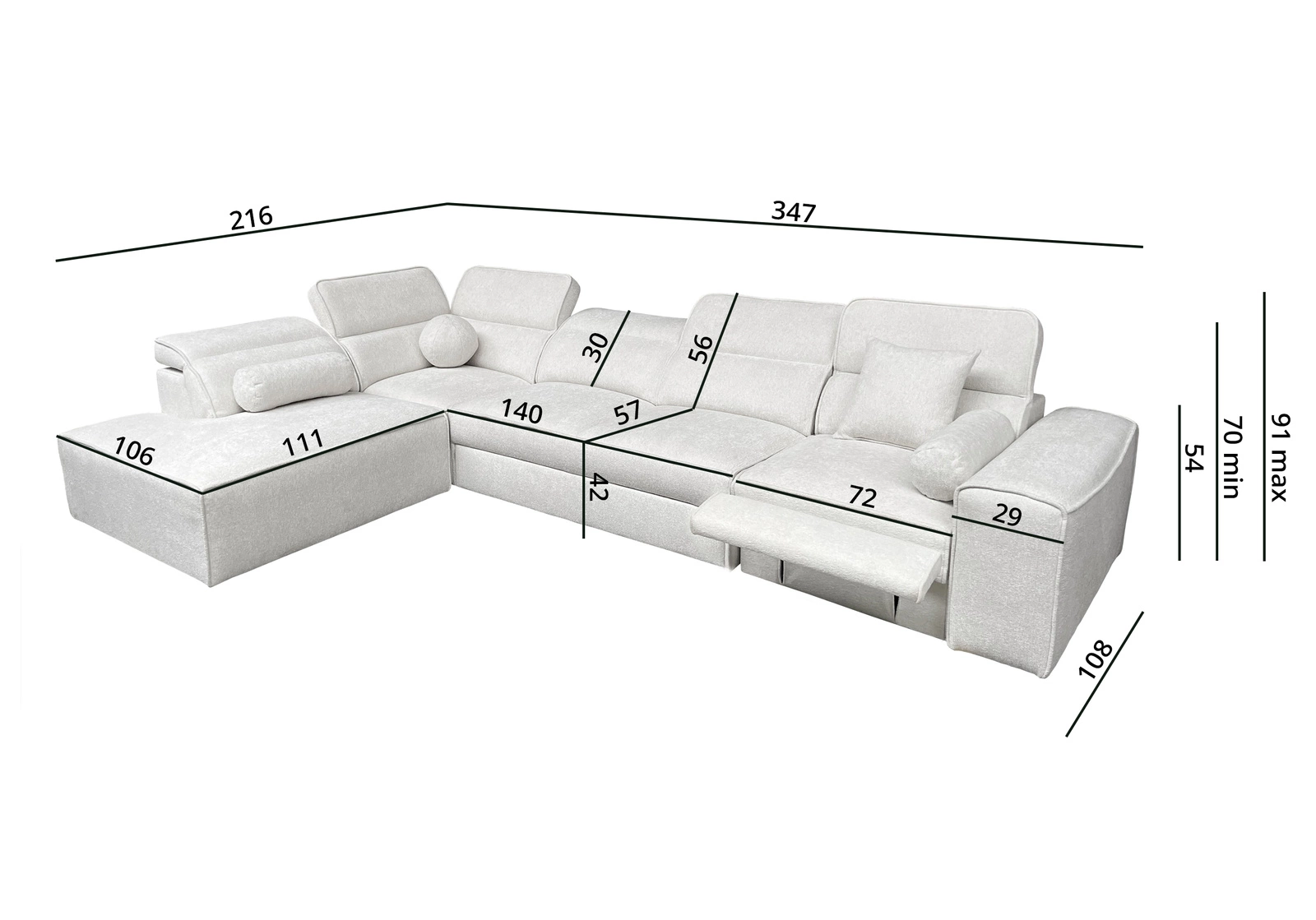 Wymiary mebla pozwolą na zagospodarowanie przestrzeni w przestronnym salonie lub pokoju dziennym. Szerokość narożnika 347 cm, wysokość 91 cm oraz głębokość 216 cm. Powierzchnia spania narożnika wynosi 127x198 cm. Wysokość siedziska mebla to 42 cm a wysokość oparcia wynosi 56 cm. Sprężyny faliste oraz pianka poliuretanowa T30 to materiał, z którego wykonane zostało siedzisko narożnika. Oparcie stałe z regulowanymi zagłówkami pozwoli na łatwe dostosowanie kąta nachylenia zagłówków do swoich preferencji oraz daje gwarancję wygodnego wypoczynku po długim dniu, które docenisz Ty, Twoi bliscy a także goście, którzy zasiądą na tym wyjątkowym narożniku.
