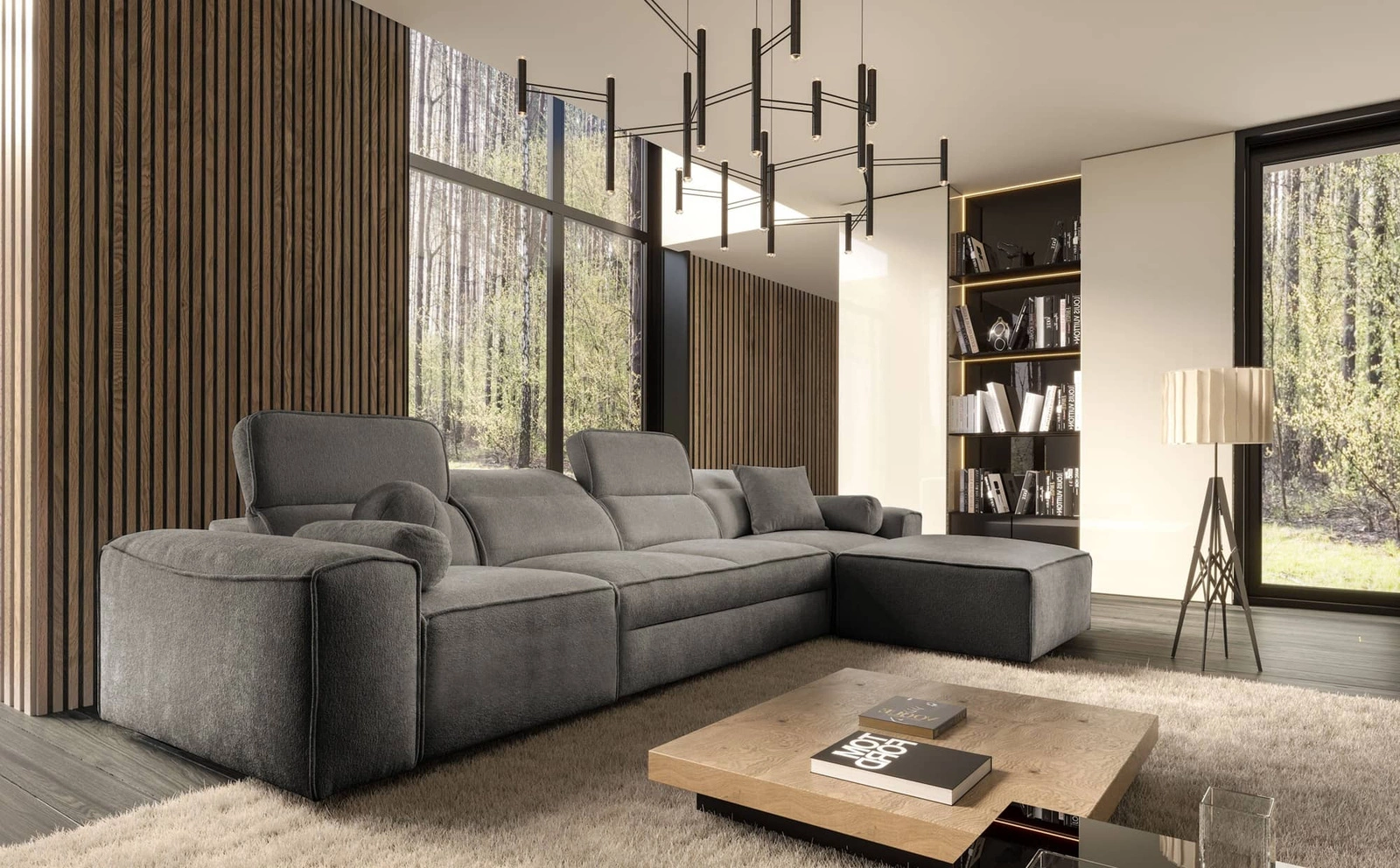 Narożnik z funkcją spania Viano XII szary prawostronny stylowy narożnik o ciekawym kształcie regulowane zagłówki ozdobne poduszki