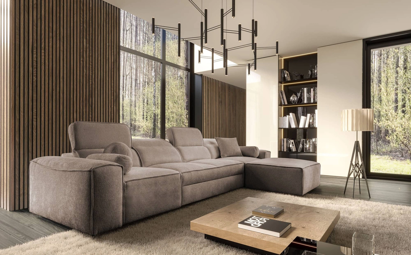 Narożnik z funkcją spania Viano XII jasny brąz prawostronny narożnik o ciekawym kształcie regulowane zagłówki ozdobne poduszki