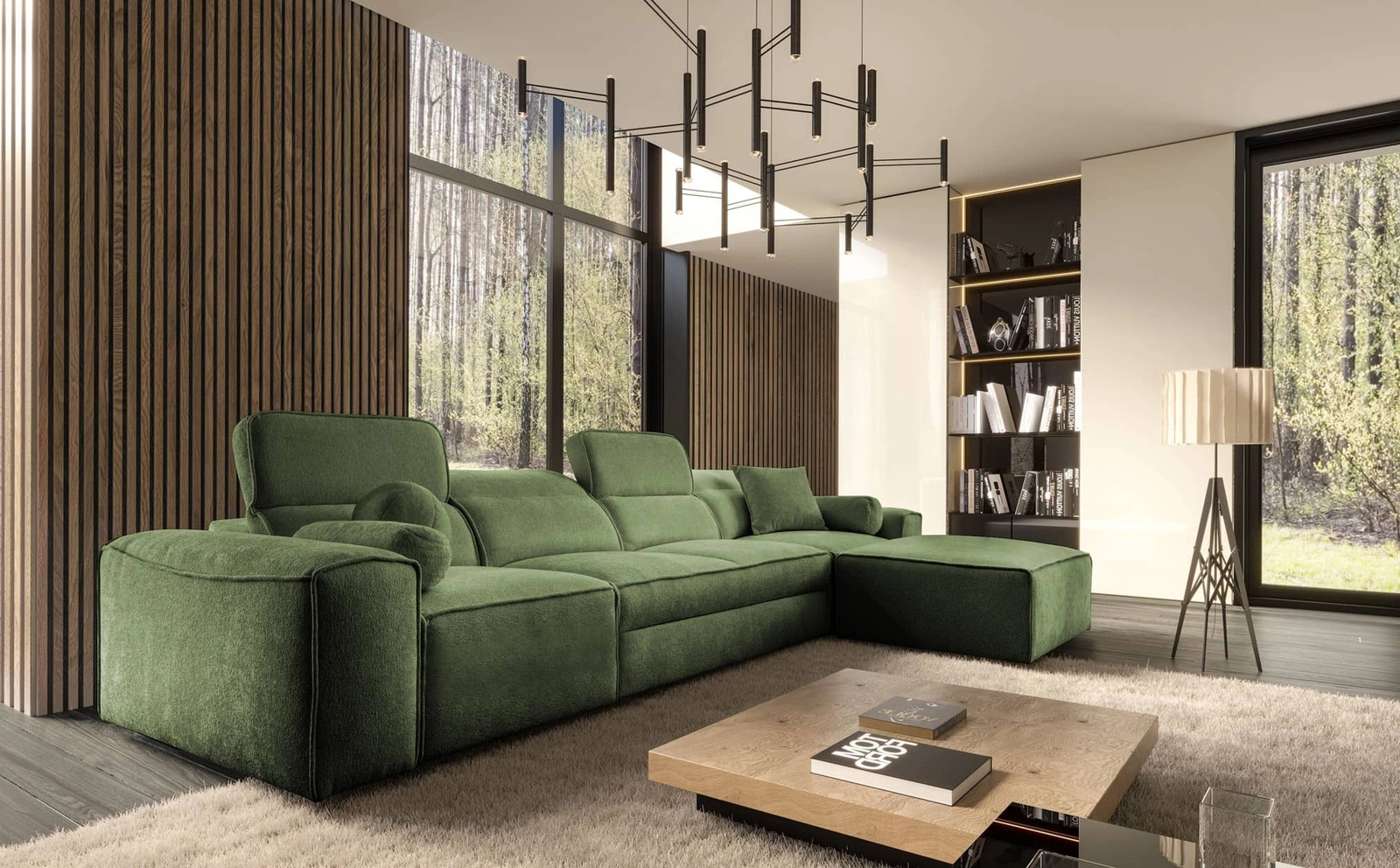 Narożnik z funkcją spania Viano XII zielony prawostronny stylowy narożnik o ciekawym kształcie regulowane zagłówki ozdobne poduszki