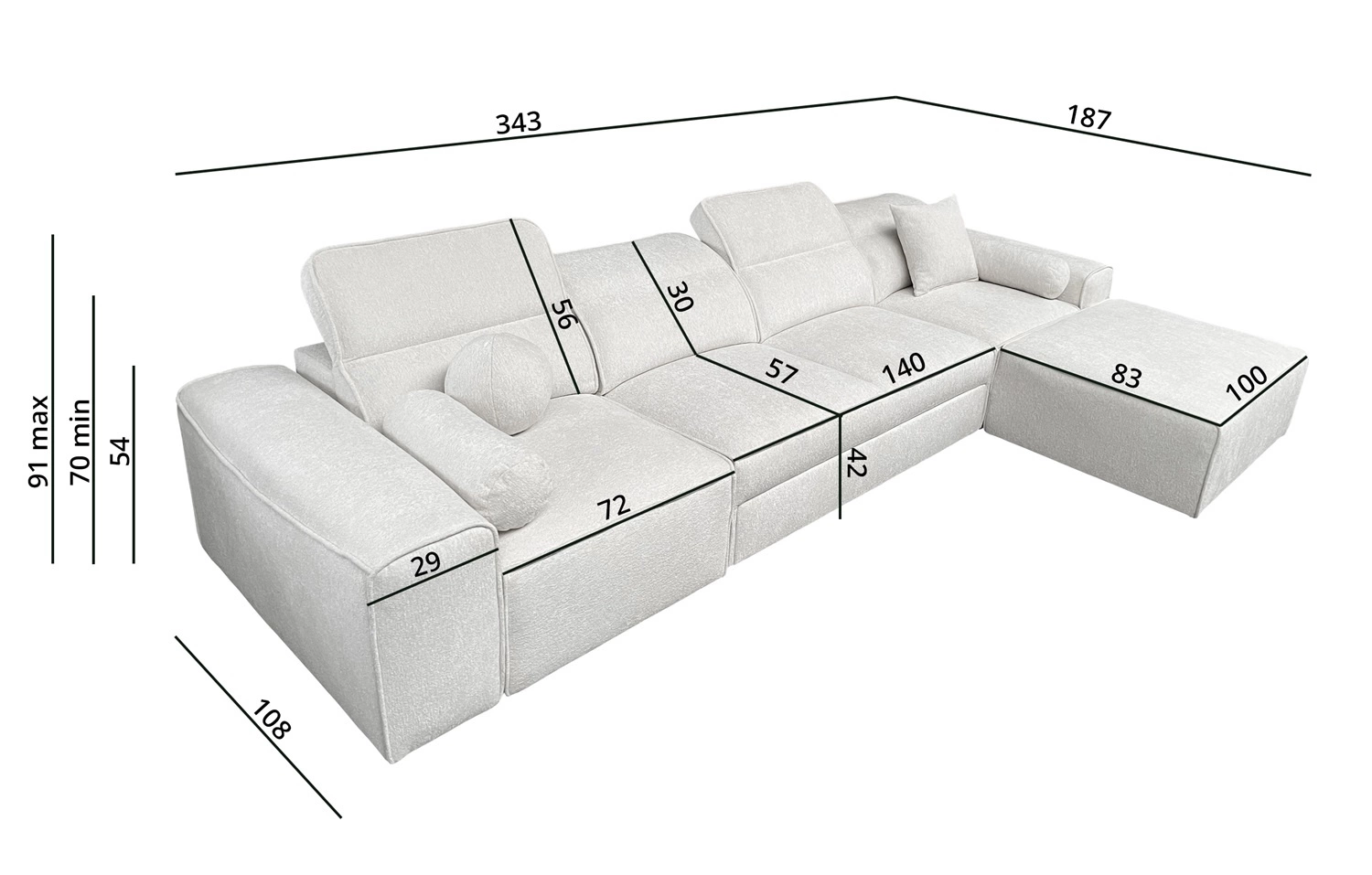Wymiary mebla pozwolą na zagospodarowanie przestrzeni w mniejszym salonie lub pokoju dziennym. Szerokość narożnika 343 cm, wysokość 91 cm oraz głębokość 187 cm. Powierzchnia spania narożnika wynosi 127x210 cm. Wysokość siedziska mebla to 42 cm a wysokość oparcia wynosi 56 cm. Sprężyny faliste oraz pianka poliuretanowa T30 to materiał, z którego wykonane zostało siedzisko narożnika. Oparcie stałe z regulowanymi zagłówkami pozwoli na łatwe dostosowanie kąta nachylenia zagłówków do swoich preferencji oraz daje gwarancję wygodnego wypoczynku po długim dniu, które docenisz Ty, Twoi bliscy a także goście, którzy zasiądą na tym wyjątkowym narożniku.