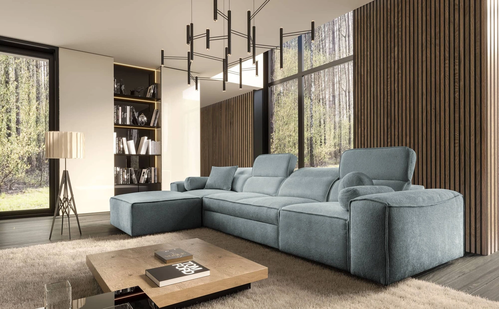 Narożnik z funkcją spania Viano XII szary błękit lewostronny narożnik o ciekawym kształcie regulowane zagłówki ozdobne poduszki