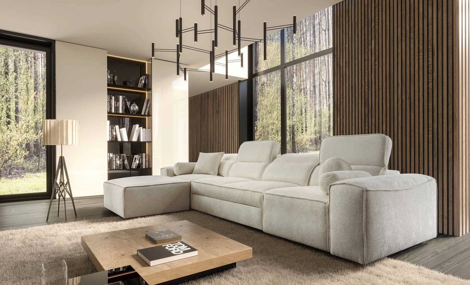 Narożnik z funkcją spania Viano XII kremowy lewostronny stylowy narożnik o ciekawym kształcie regulowane zagłówki ozdobne poduszki