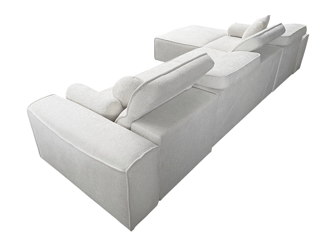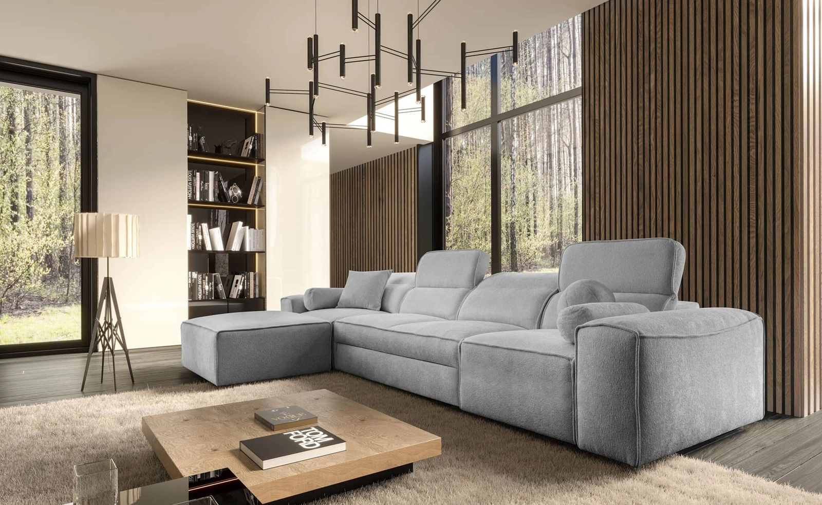 Narożnik z funkcją spania Viano XII jasny szary lewostronny stylowy narożnik o ciekawym kształcie regulowane zagłówki ozdobne poduszki