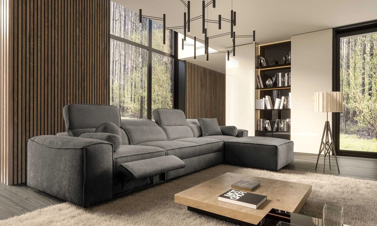 Narożnik z funkcją spania Viano XII Lux szary prawostronny designerski narożnik do salonu z komfortowym wysuwanym podnóżkiem