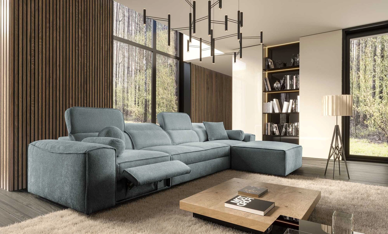 Narożnik Viano XII Lux w kolorze szary błękit z wysuwanym podnóżkiem to ciekawie prezentujący się mebel o eleganckim wykończeniu.