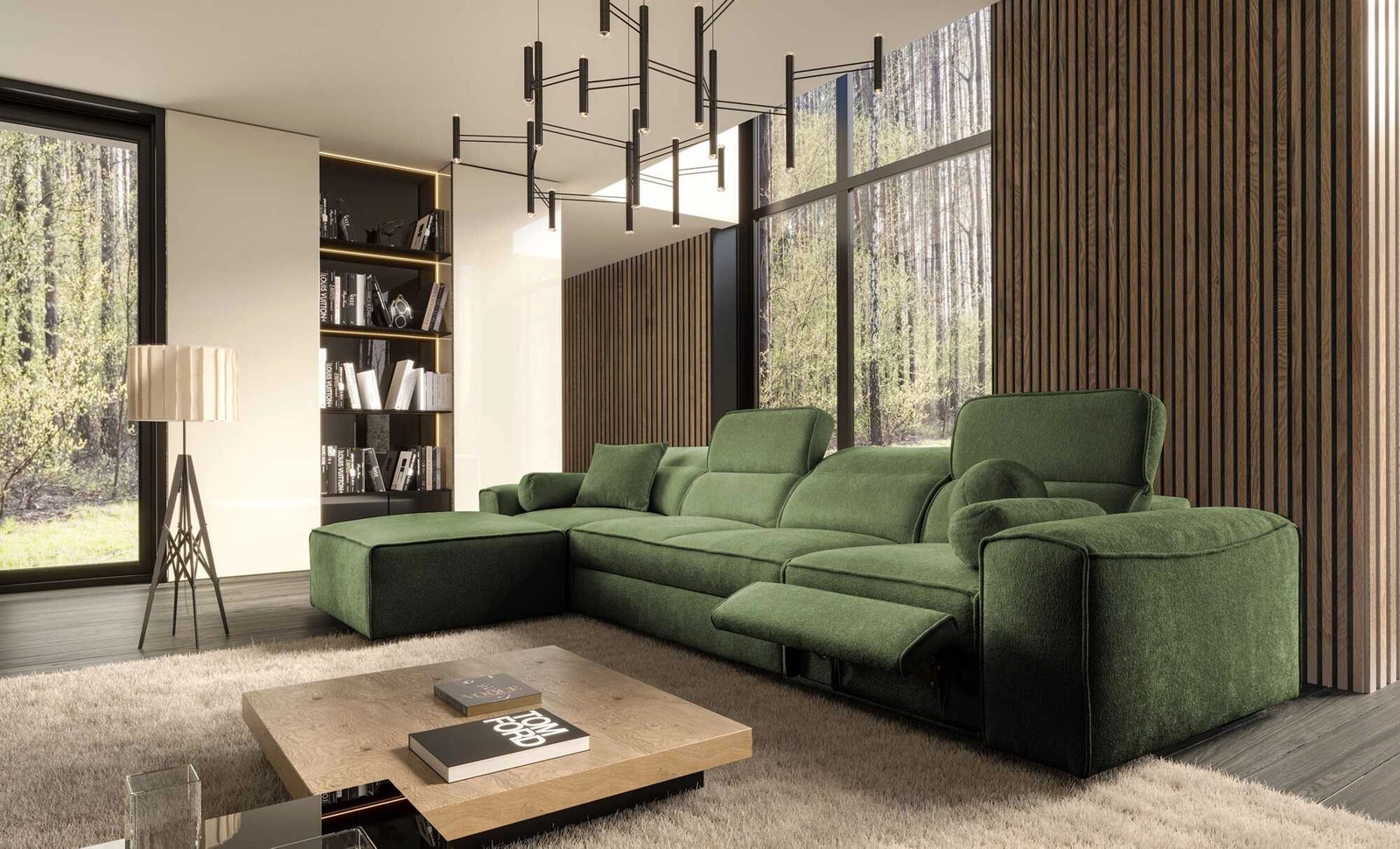 Narożnik z funkcją spania Viano XII Lux zielony lewostronny designerski narożnik do salonu z komfortowym wysuwanym podnóżkiem