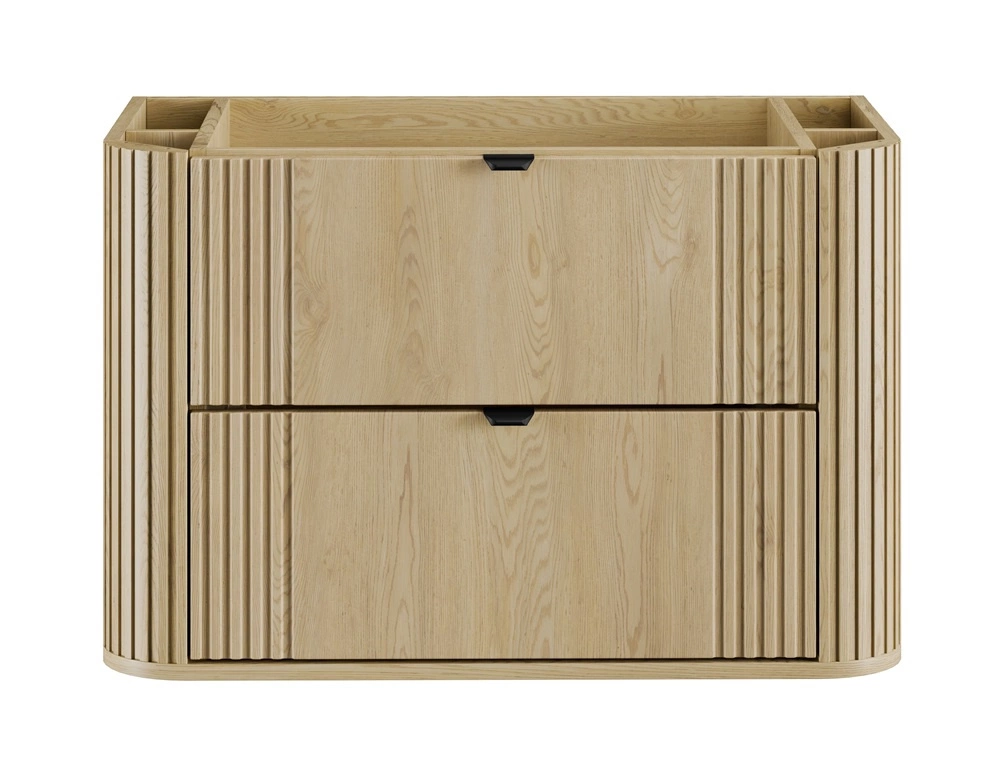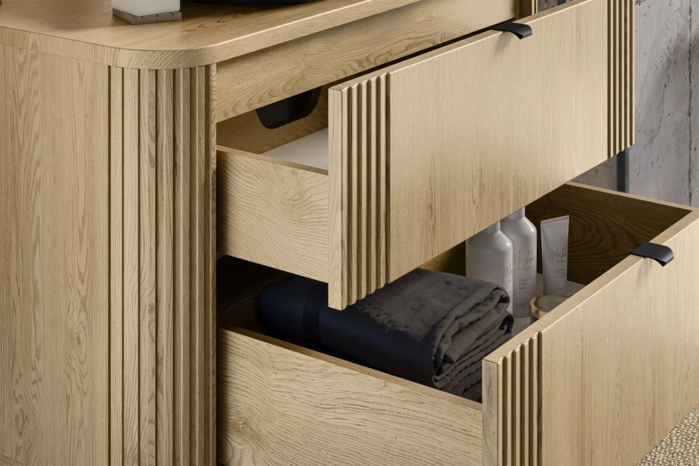 Szafka pod umywalkę z kolekcji Ovalia Cremona tworzy wyrazisty akcent we wnętrzu poprzez unikalne połączenie subtelności i charakteru, które natychmiast przyciąga wzrok. Charakterystyczne zaokrąglone rogi szafek dodają bryłom wizualnej lekkości, a wyraziste, pionowe ryflowania podkreślają ich wyjątkową formę. Ciepły dekor dębu cremona odwzorowuje naturalne piękno drewna, tworząc przytulną atmosferęCałości dopełniają czarne, metalowe uchwyty krawędziowe, które wprowadzają interesujący kontrast i nadają eleganckiego wykończenia.