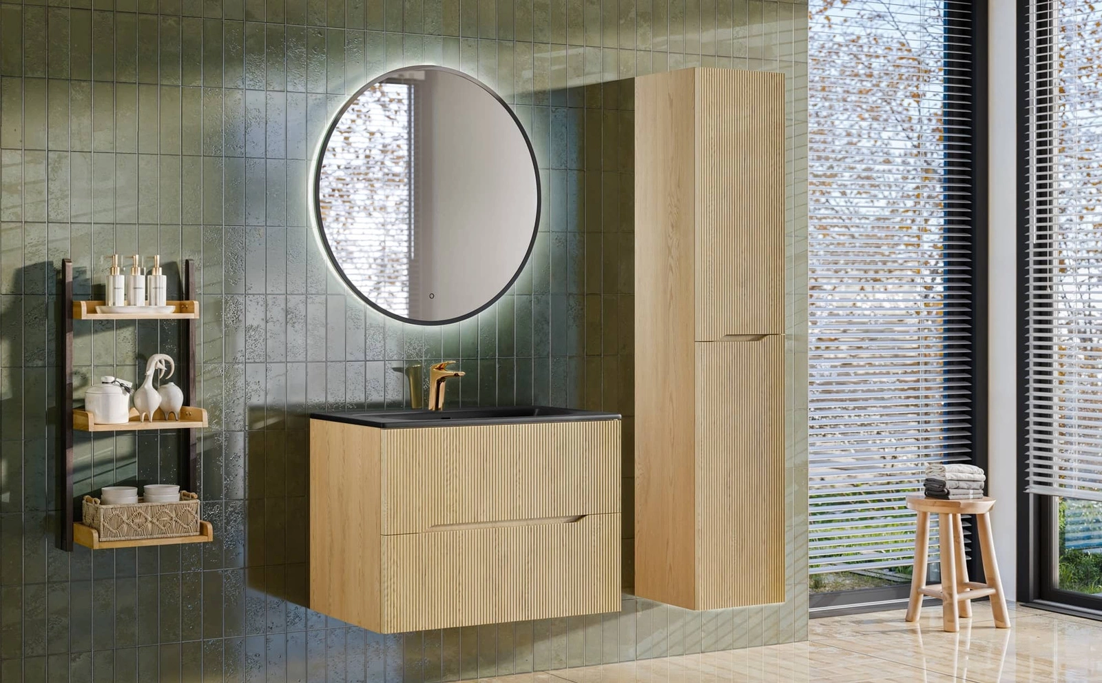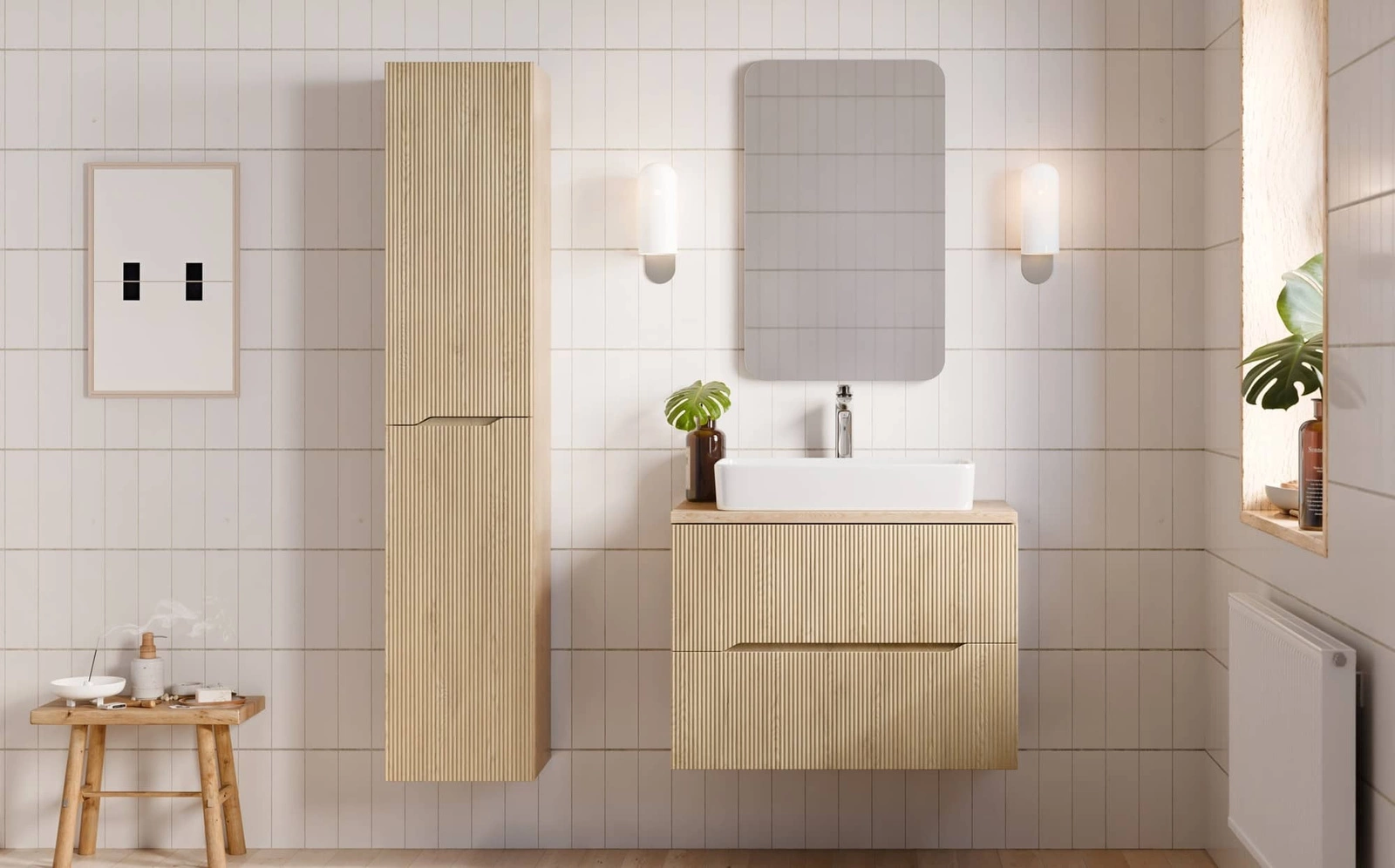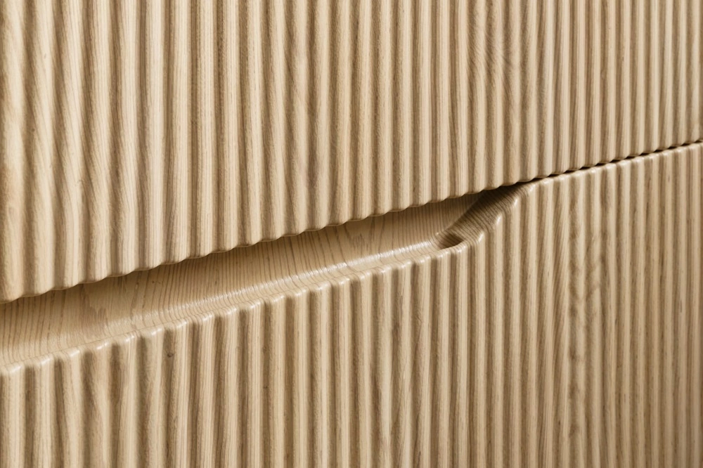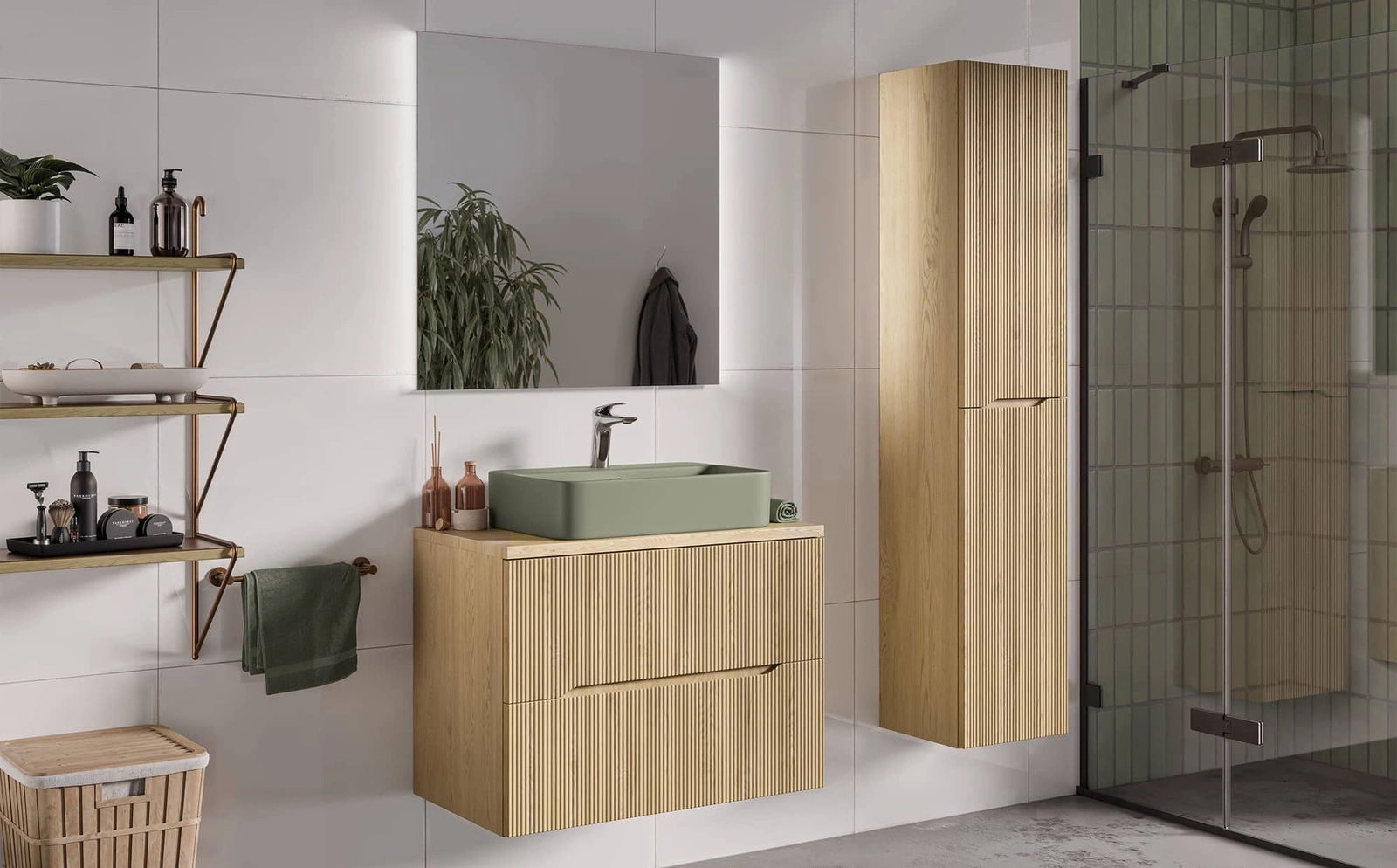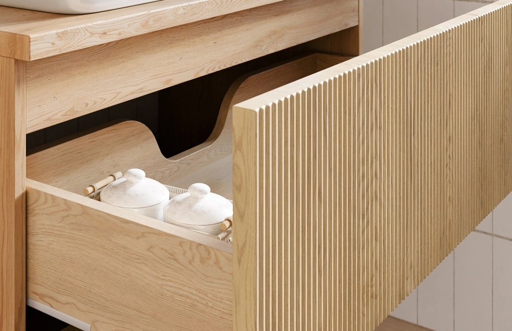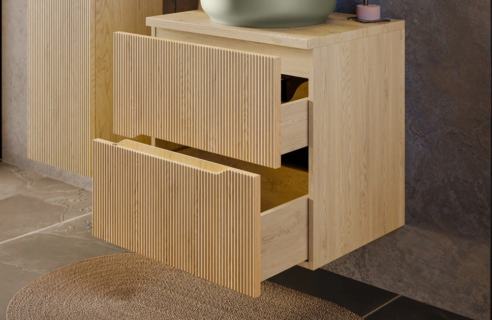 Szafka pod umywalkę z kolekcji Nordic Cremona to wyważone połączenie nowoczesnej formy i subtelnej elegancji. Fronty zdobione delikatnymi, pionowymi ryflowaniami nadają meblom lekkości i wyrafinowanego charakteru, a dekor dębu cremona ociepla wnętrze, odwzorowując naturalne piękno drewna. Asymetryczny, frezowany uchwyt wkomponowany w bryłę mebla, nadaje całości nowoczesnego i spójnego wyglądu.