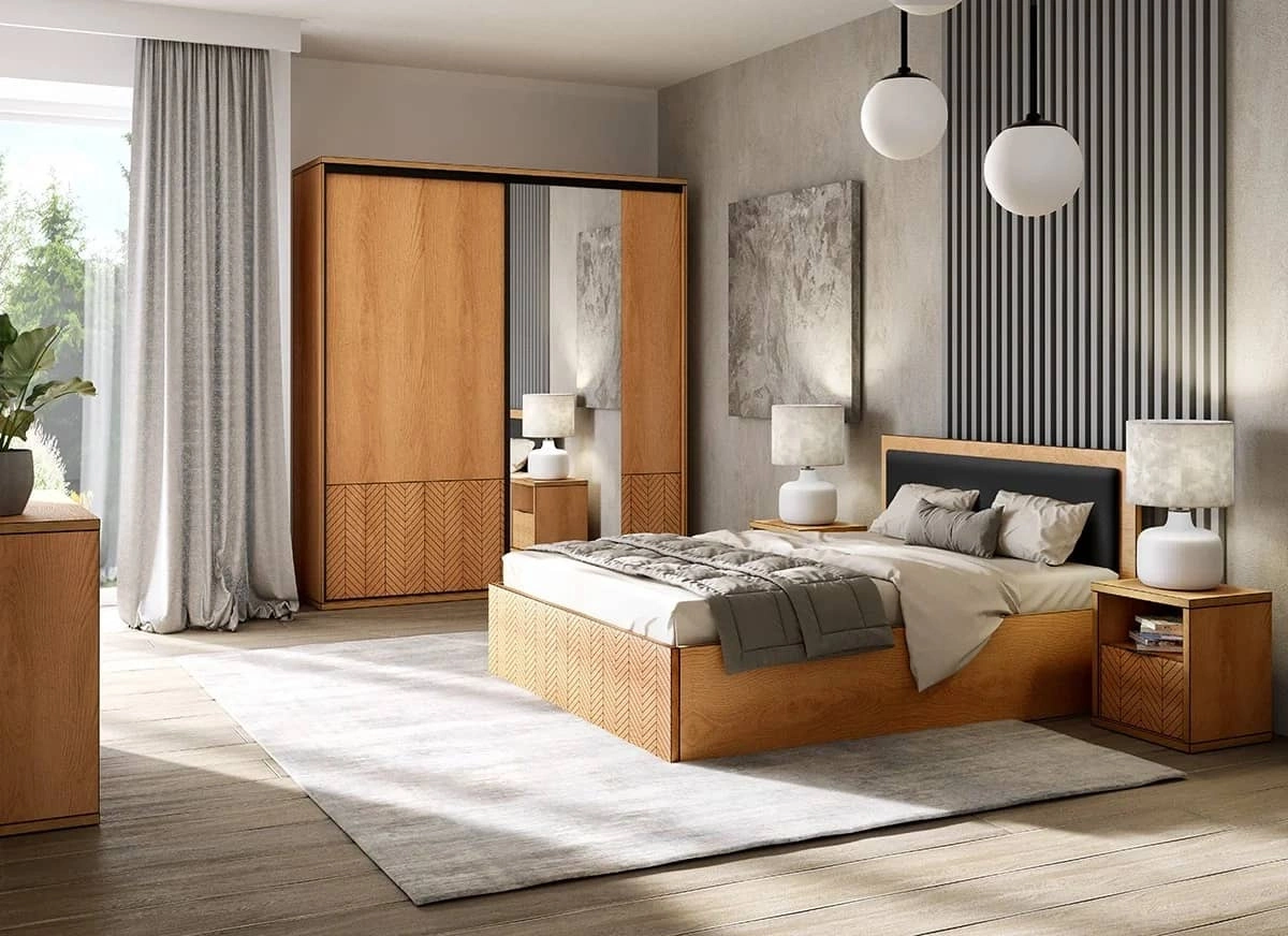 Szafa przesuwna z lustrem Fonti 199 cm dąb karmel nowoczesny design mebla drzwi szafy ozdobione dekorem jodełki
