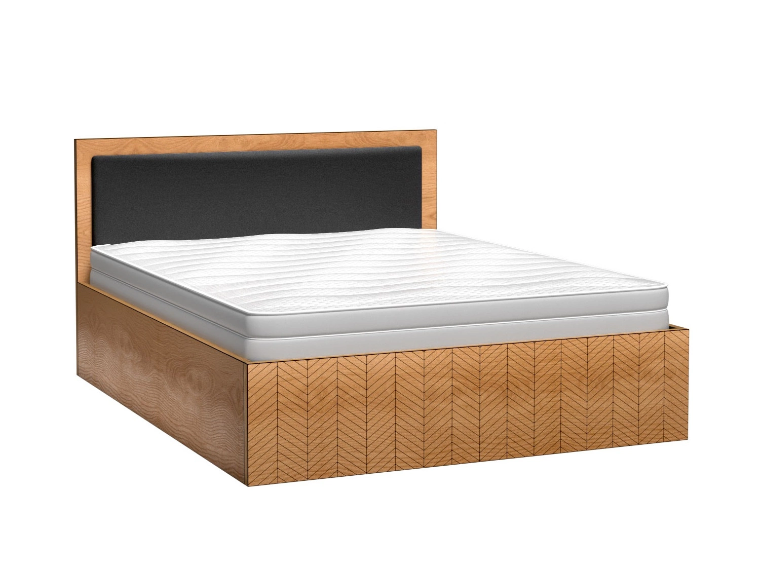 Łóżko Fonti z kolekcji Fonti to mebel o wyraźnych, geometrycznych kształtach oraz harmonijnych proporcjach. Naturalny i ciepły odcień karmelowego dębu doskonale odnajdzie się w każdym wnętrzu, nadając przy tym przytulnego klimatu. Oryginalny wzór na ramie łóżka w postaci czarnej jodełki stanowi elegancki detal przyciągający wzrok. Nietuzinkowym wykończeniem łóżka z kolekcji Fonti są niepowtarzalne czarne brzegi, które dodatkowo podkreślają innowacyjność bryły. Częściowo tapicerowany zagłówek w kolorze czarnym to element, który przyciąga wzrok. Dzięki tapicerowanemu oparciu łóżko zyskuje kolejną funkcję. Można wygodnie siedzieć na łóżku, np. oglądając telewizję, pracując przy laptopie lub czytając książki.
