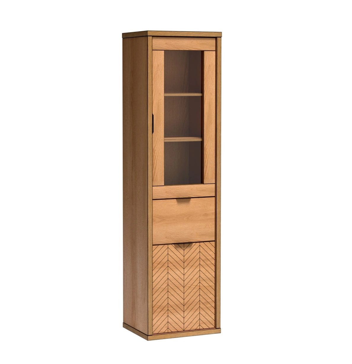 Zestaw mebli do salonu Fonti dąb karmel fronty ozdobione dekorem jodełki elementy z bezpiecznego szkła stylowe czarne uchwyty