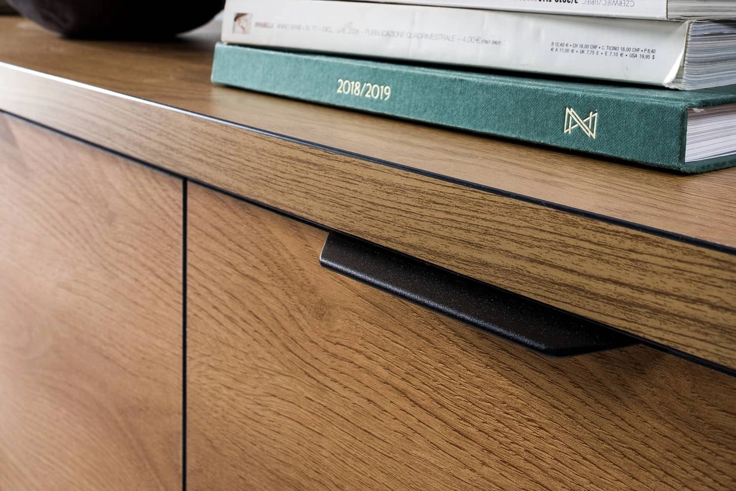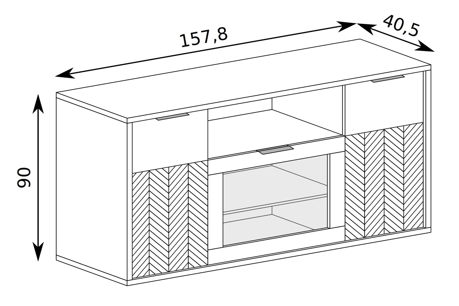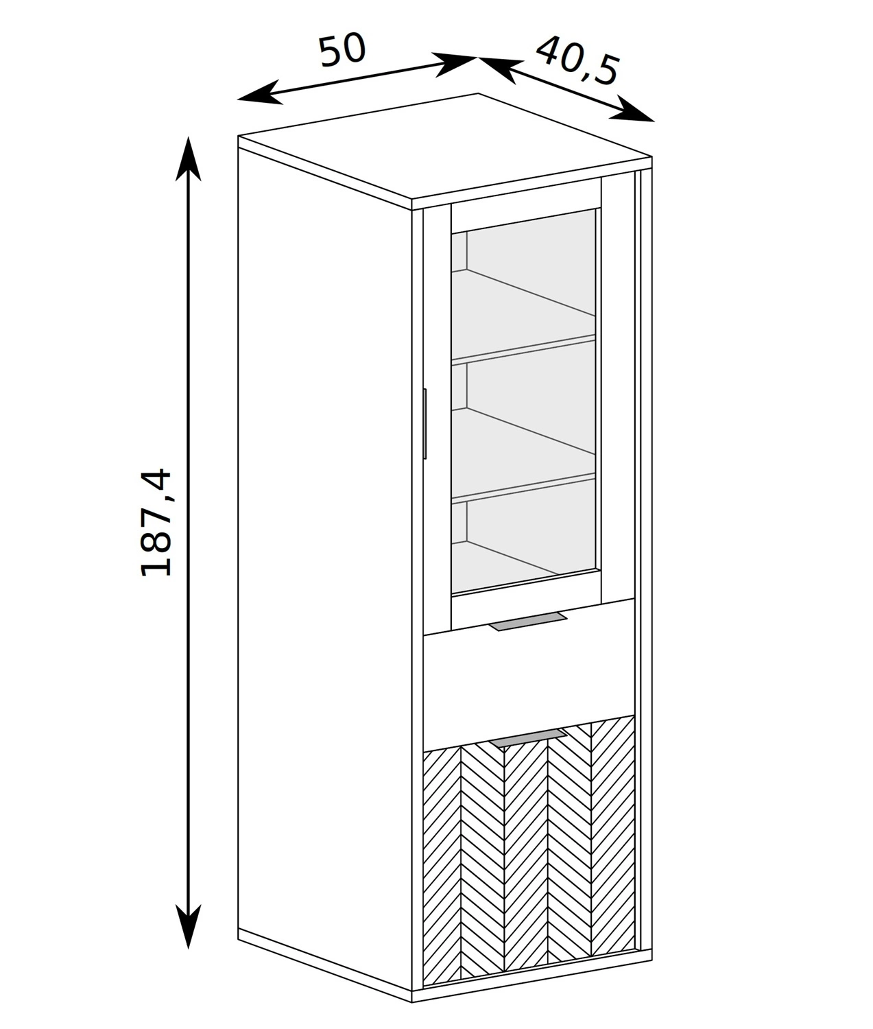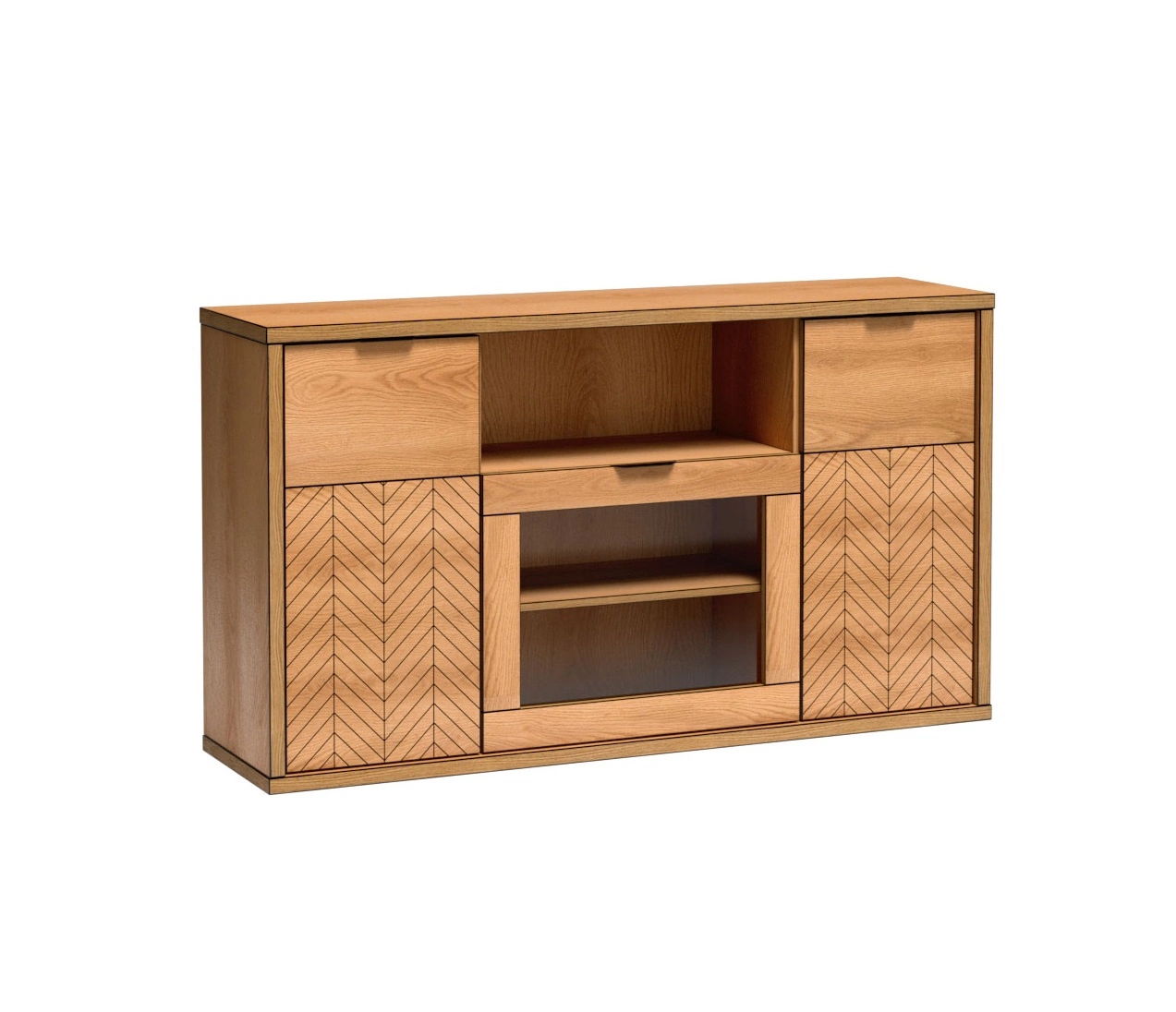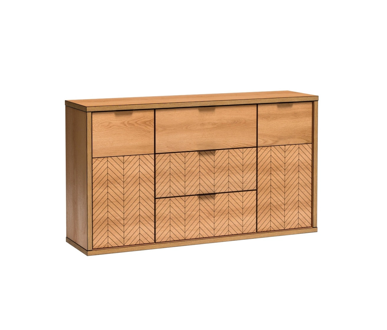 Zestaw mebli do salonu Fonti to meble o wyraźnych, geometrycznych kształtach oraz harmonijnych proporcjach. Naturalny i ciepły odcień karmelowego dębu doskonale odnajdzie się w każdym wnętrzu, nadając przy tym przytulnego klimatu. Oryginalny wzór na frontach w postaci czarnej jodełki stanowi elegancki detal przyciągający wzrok. Nietuzinkowym wykończeniem mebli z kolekcji Fonti są niepowtarzalne czarne brzegi, a także stylowe uchwyty krawędziowe, które dodatkowo podkreślają innowacyjność brył. Komplet mebli z powodzeniem odnajdzie się we wnętrzach w stylu skandynawskim jak i nowoczesnym.