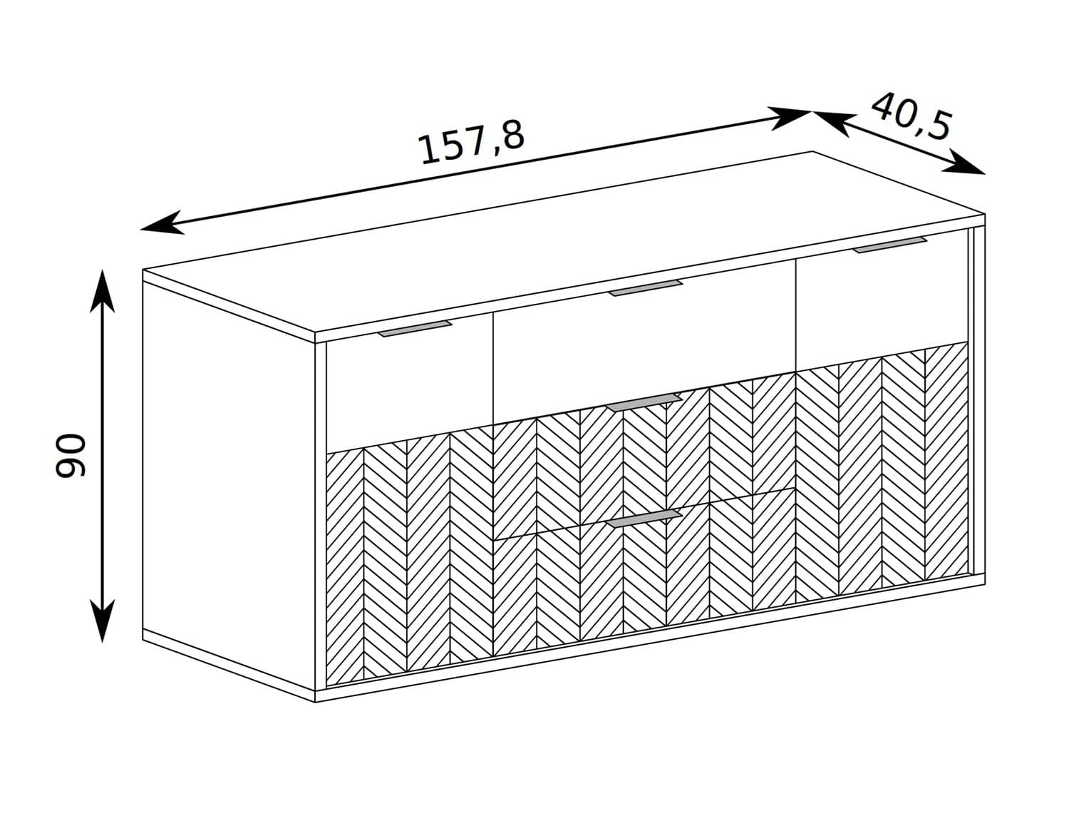 - Zestaw mebli Fonti to meble o geometrycznych kształtach i harmonijnych proporcjach. Oryginalny wzór na frontach w postaci czarnej jodełki stanowi elegancki detal przyciągający wzrok. Odcień karmelowego dębu doskonale odnajdzie się w każdym wnętrzu.