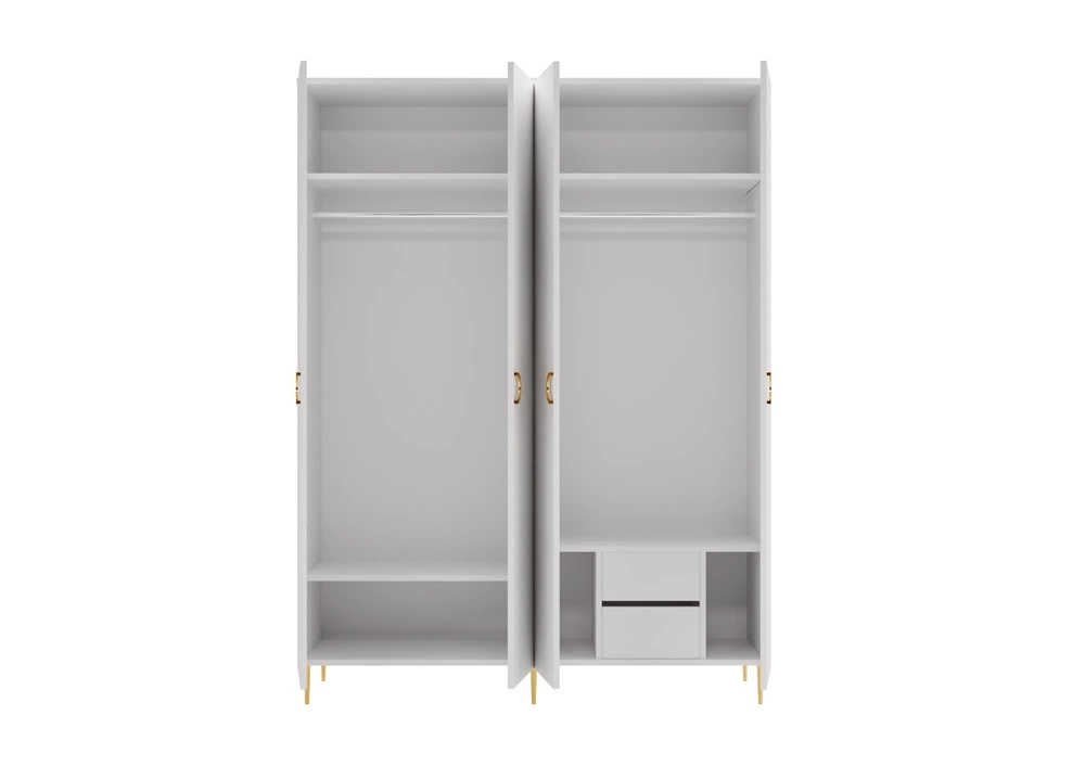 Wnętrze szafy Belluna wyposażone jest w dwie szuflady oraz dzieli się na część z drążkami na ubrania wiszące i część z półkami. Metalowe nogi utrzymane w złotym kolorze nadają wizualnej lekkości przy jednoczesnym utrzymaniu funkcjonalności. Szafa do sypialni została wykonana z wysokiej jakości płyty laminowanej o grubości 16mm, która charakteryzuje się odpornością na wpływ czynników zewnętrznych takich jak obicia, uderzenia i niefortunne zadrapania. Precyzyjne wykończenie i dbałość o detale sprawiają, że szafa Belluna zachowa swój piękny wygląd na wiele lat, nie tracąc przy tym na funkcjonalności.