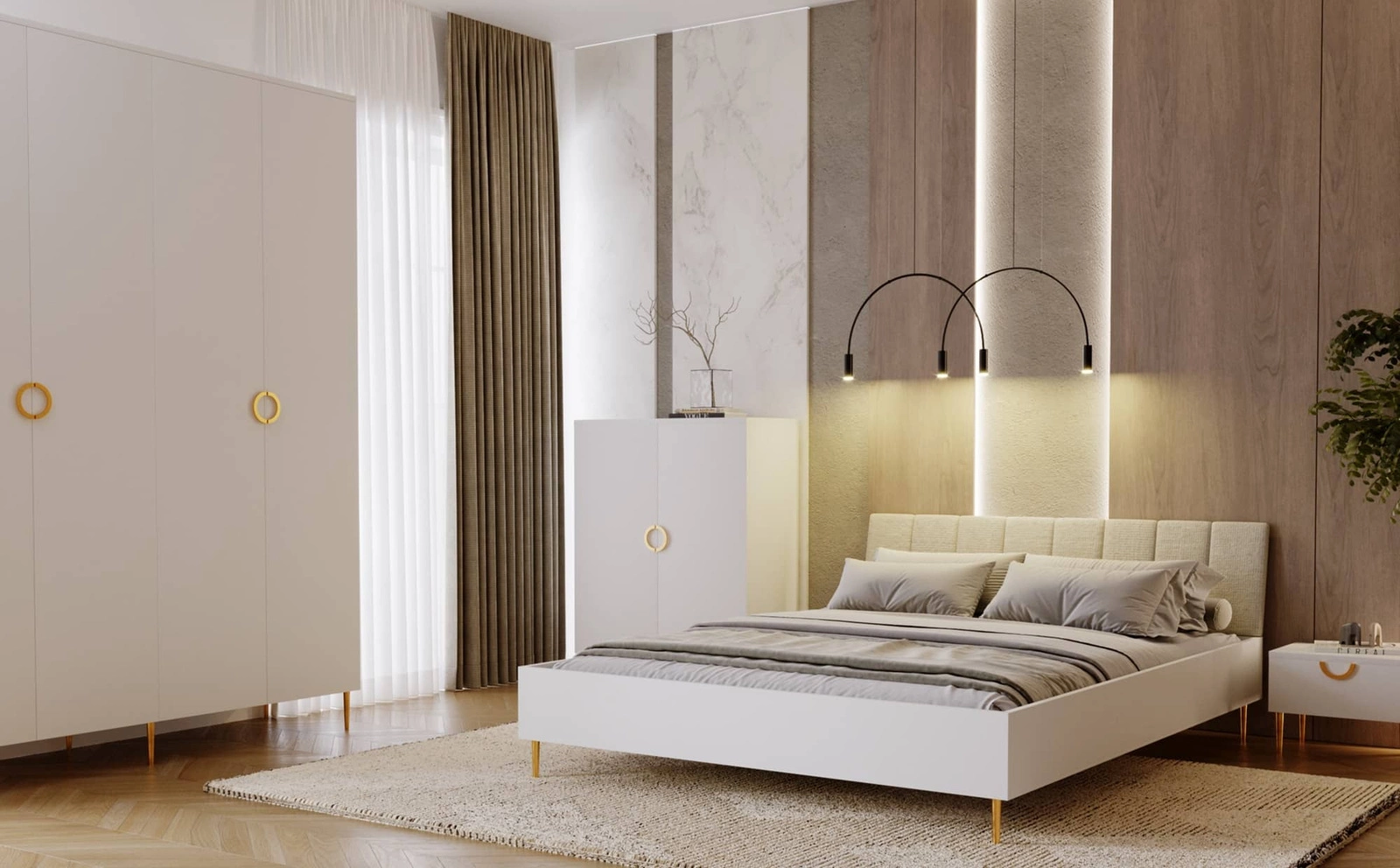 Zestaw mebli Belluna to stylowe bryły, które dzięki prostym liniom oraz minimalistycznemu wzornictwu staną się nowoczesną wizytówką każdej sypialni. Gładkie wykończenie frontów harmonijnie łączy się z subtelną kolorystyką w kaszmirowym odcieniu nadając kolekcji wyjątkowego wyglądu i niepowtarzalnego charakteru. Elementami przyciągającymi wzrok są złote uchwyty o niebanalnym kształcie, które podkreślają elegancki charakter brył. Meble z kolekcji Belluna to funkcjonalne i stylowe meble, idealne dla osób, które cenią minimalizm, komfort i dopracowany design.