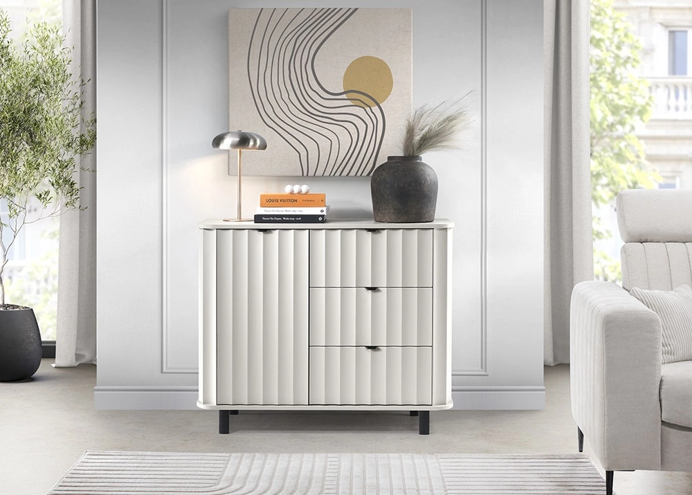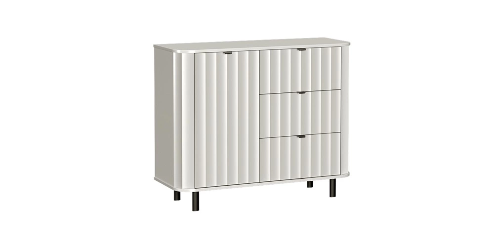 - Komoda Novado to świeże spojrzenie na współczesny design. Miękkie linie, zaokrąglone krawędzie i dekoracyjny frezowany front w pionowe fale nadają wnętrzu harmonii i lekkości. Czarne, niewielkie uchwyty i smukłe nogi dodają industrialnego akcentu.