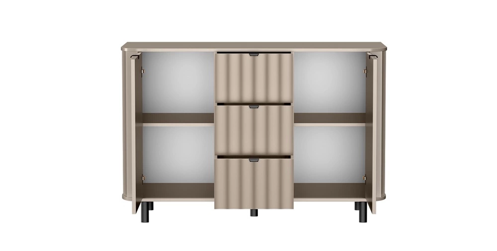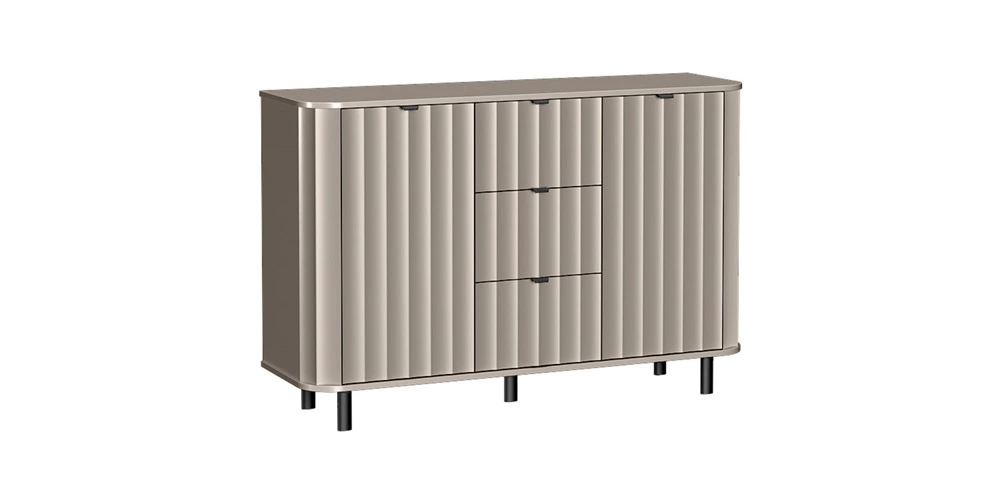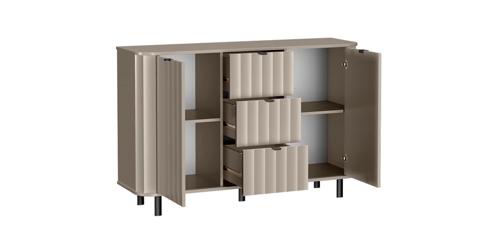 Komoda z szufladami z kolekcji Novado to mebel, który łączy w sobie elegancję i funkcjonalność. Miękkie linie, zaokrąglone krawędzie blatów i dekoracyjny frezowany front w pionowe fale nadają wnętrzu harmonii i lekkości. Dzięki modnej kolorystyce w szaro beżowym odcieniu komoda z szufladami Novado wpisuje się w różne style aranżacyjne, od nowoczesnych po minimalistyczne w duchu soft modern. Niewielkie, metalowe uchwyty krawędziowe oraz smukłe nogi w kolorze czarnym dodają industrialnego akcentu. Komoda Novado nie tylko zdobi wnętrze, ale również porządkuje i organizuje przestrzeń.