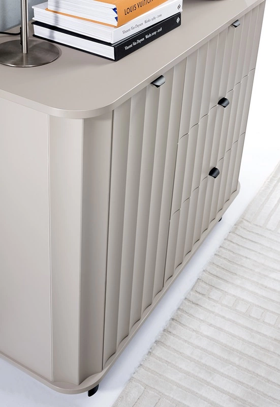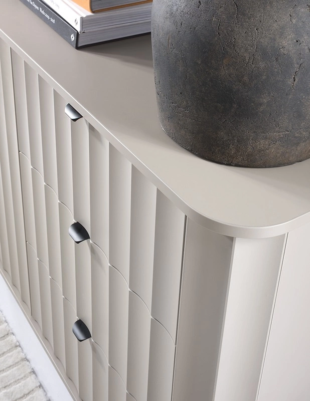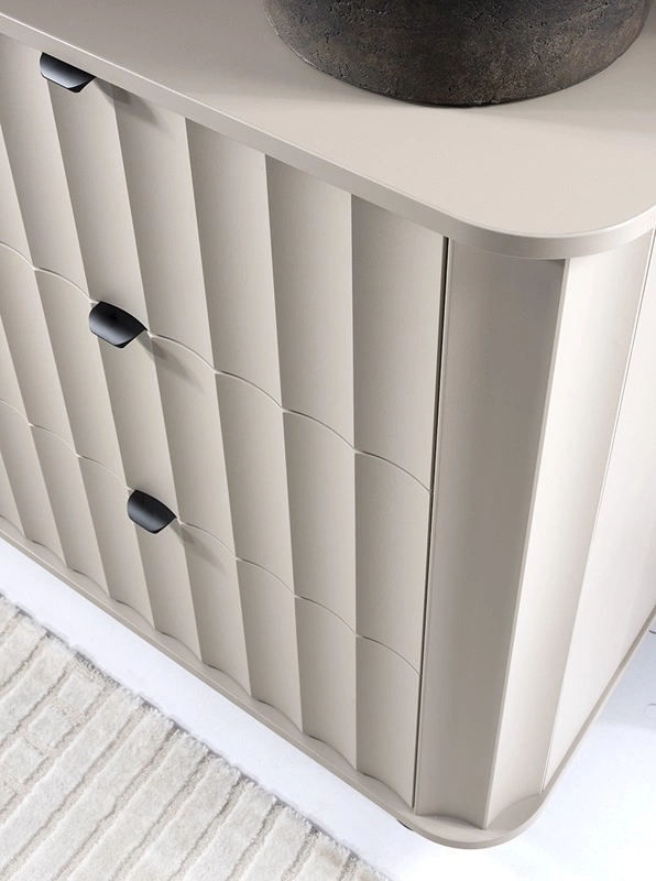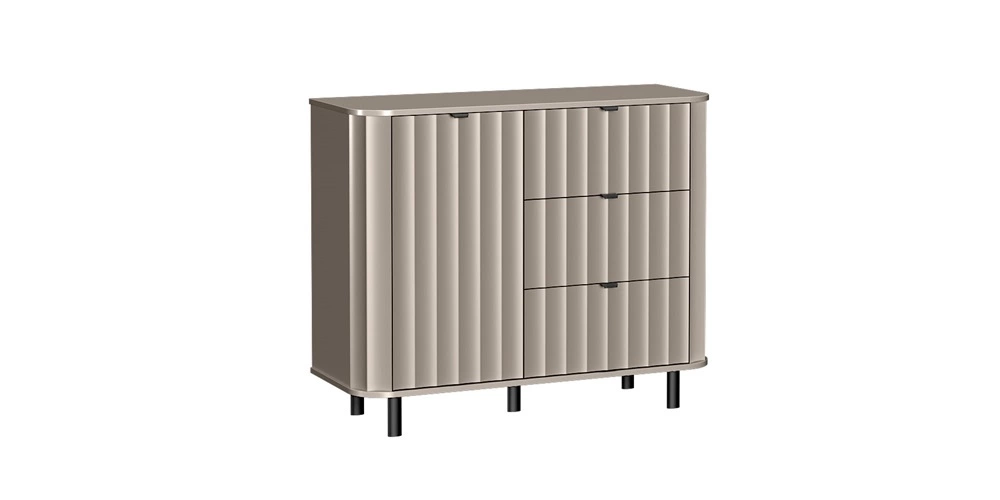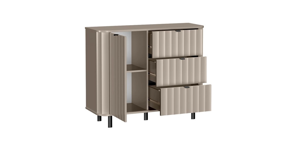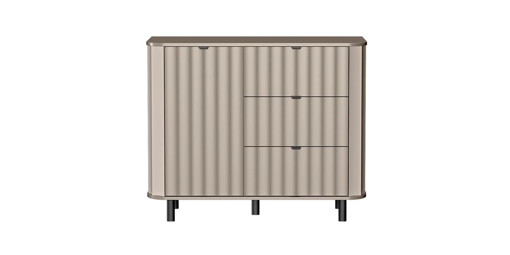 Komoda z szufladami z kolekcji Novado to mebel, który łączy w sobie elegancję i funkcjonalność. Miękkie linie, zaokrąglone krawędzie blatów i dekoracyjny frezowany front w pionowe fale nadają wnętrzu harmonii i lekkości. Dzięki modnej kolorystyce w szaro beżowym odcieniu komoda z szufladami Novado wpisuje się w różne style aranżacyjne, od nowoczesnych po minimalistyczne w duchu soft modern. Niewielkie, metalowe uchwyty krawędziowe oraz smukłe nogi w kolorze czarnym dodają industrialnego akcentu. Komoda Novado nie tylko zdobi wnętrze, ale również porządkuje i organizuje przestrzeń.