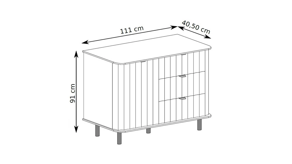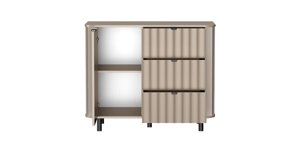 - Komoda Novado to świeże spojrzenie na współczesny design. Miękkie linie, zaokrąglone krawędzie i dekoracyjny frezowany front w pionowe fale nadają wnętrzu harmonii i lekkości. Czarne, niewielkie uchwyty i smukłe nogi dodają industrialnego akcentu.
