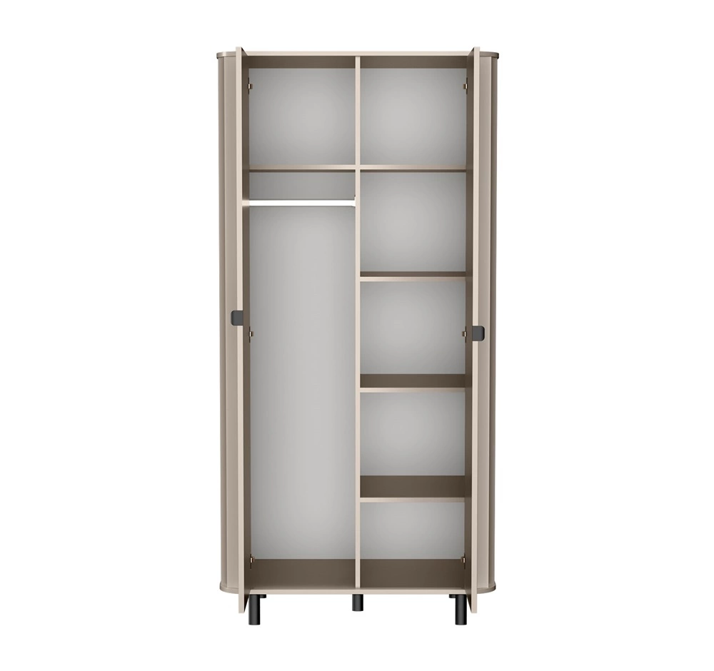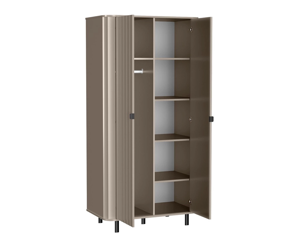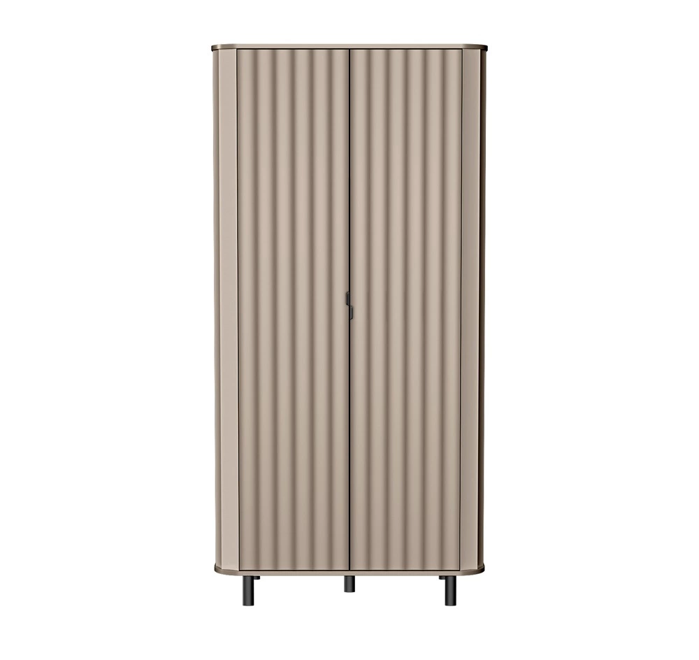 Szafa z kolekcji Novado to mebel, który łączy w sobie elegancję i funkcjonalność. Miękkie linie, zaokrąglone krawędzie blatów i dekoracyjny frezowany front w pionowe fale nadają wnętrzu harmonii i lekkości. Dzięki modnej kolorystyce w szaro beżowym odcieniu szafa uchylna Novado wpisuje się w różne style aranżacyjne, od nowoczesnych po minimalistyczne w duchu soft modern. Niewielkie, metalowe uchwyty krawędziowe oraz smukłe nogi w kolorze czarnym dodają industrialnego akcentu. Szafa na ubrania Novado nie tylko zdobi wnętrze, ale również porządkuje i organizuje przestrzeń.
