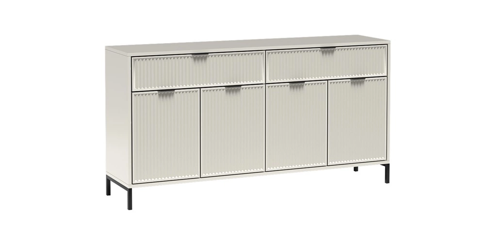Komoda z szufladami Linka 165 cm beżowa elegancki design geometrczny kształt bryły osadzony na metalowych nogach gustowny ryflowany front