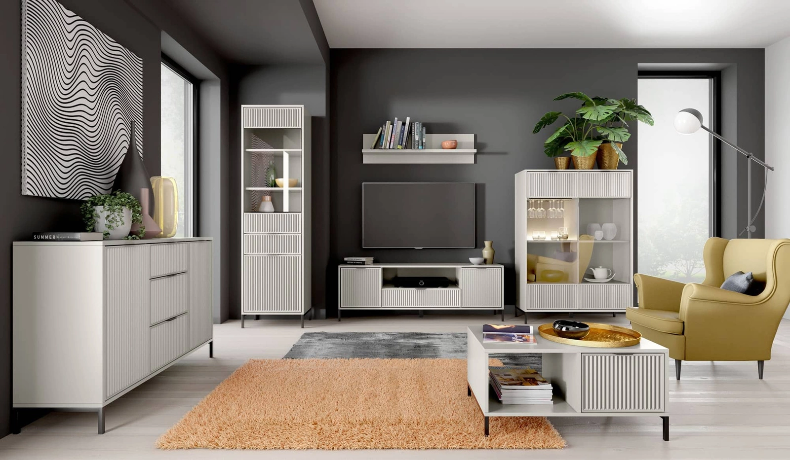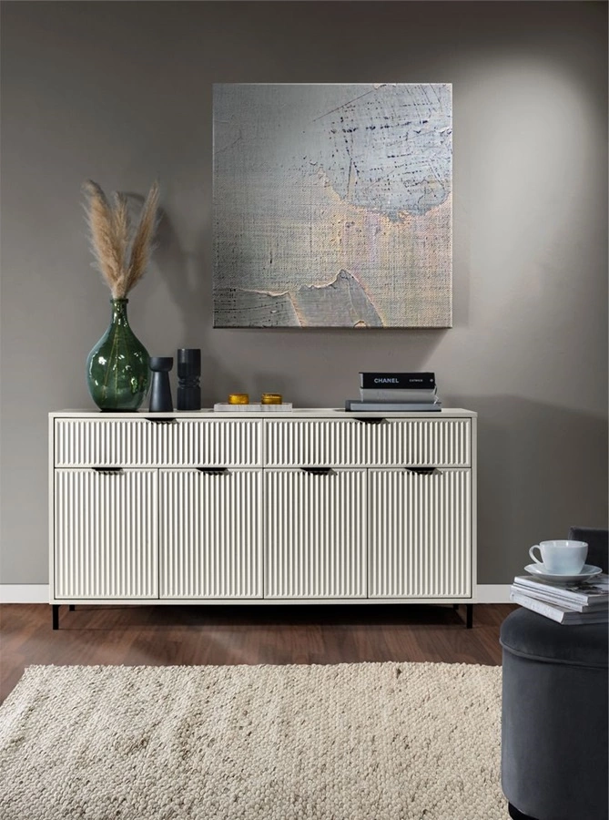 Komoda z szufladami z kolekcji Linka to zachwycający mebel o szczególnym i niepowtarzalnym charakterze. Niezwykłe połączenie jasnego beżu w kaszmirowym odcieniu z geometrycznym kształtem bryły sprawia, że całość prezentuje się stylowo oraz bardzo nowocześnie. Ciekawy wzór na frontach w postaci frezowanych ryfli nadaje finezji i elegancji dodatkowo tworząc efektowną dekorację. Designerskie, metalowe uchwyty krawędziowe oraz smukłe nogi w kolorze czarnym dodają industrialnego akcentu. Komoda do salonu Linka nie tylko zdobi wnętrze, ale również porządkuje i organizuje przestrzeń.