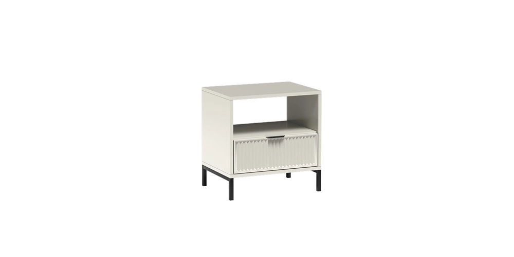 Szafka nocna z kolekcji Linka to zachwycający mebel o szczególnym i niepowtarzalnym charakterze. Niezwykłe połączenie jasnego beżu w kaszmirowym odcieniu z geometrycznym kształtem bryły sprawia, że całość prezentuje się stylowo oraz bardzo nowocześnie. Ciekawy wzór na frontach w postaci frezowanych ryfli nadaje finezji i elegancji dodatkowo tworząc efektowną dekorację. Designerskie, metalowe uchwyty krawędziowe oraz smukłe nogi w kolorze czarnym dodają industrialnego akcentu. Szafka nocna do sypialni Linka nie tylko zdobi wnętrze, ale również porządkuje i organizuje przestrzeń.