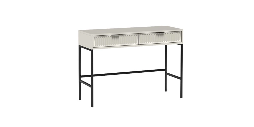 Konsola z kolekcji Linka to zachwycający mebel o szczególnym i niepowtarzalnym charakterze. Niezwykłe połączenie jasnego beżu w kaszmirowym odcieniu z geometrycznym kształtem bryły sprawia, że całość prezentuje się stylowo oraz bardzo nowocześnie. Ciekawy wzór na frontach w postaci frezowanych ryfli nadaje finezji i elegancji dodatkowo tworząc efektowną dekorację. Designerskie, metalowe uchwyty krawędziowe oraz wysoka podstawa w kolorze czarnym dodają industrialnego akcentu. Toaletka do sypialni Linka nie tylko zdobi wnętrze, ale również porządkuje i organizuje przestrzeń.