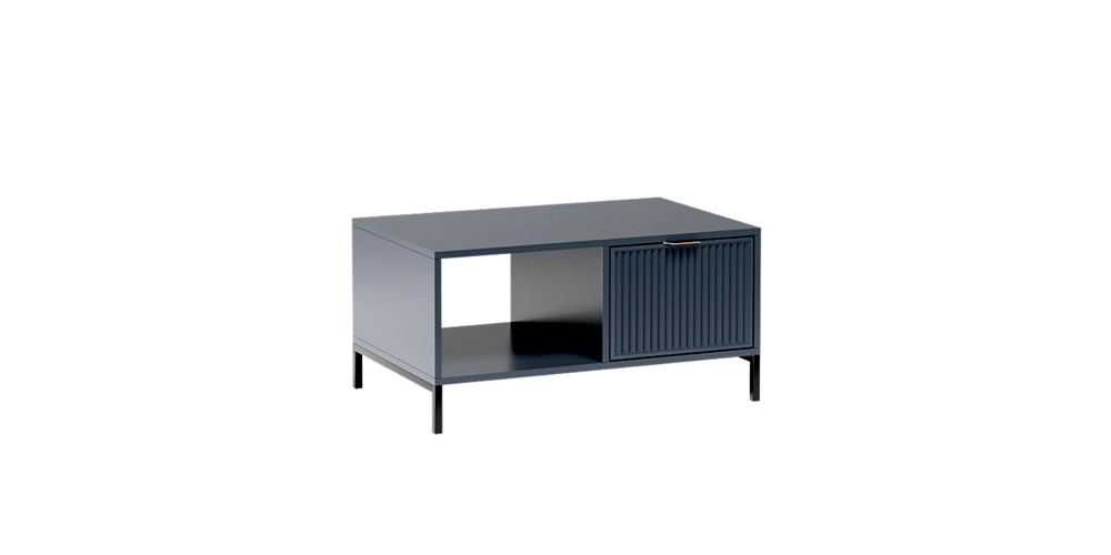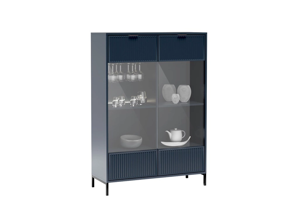 Zestaw mebli Linka to zachwycające bryły o szczególnym i niepowtarzalnym charakterze. Niezwykłe połączenie głębokiego koloru indigo z geometrycznym kształtem bryły sprawia, że całość prezentuje się stylowo oraz bardzo nowocześnie. Ciekawy wzór na frontach w postaci frezowanych ryfli nadaje finezji i elegancji dodatkowo tworząc efektowną dekorację. Designerskie, metalowe uchwyty krawędziowe w kolorze miedzi oraz smukłe, czarne nogi dodają industrialnego akcentu. Meblościanka do salonu Linka nie tylko zdobi wnętrze, ale również porządkuje i organizuje przestrzeń.