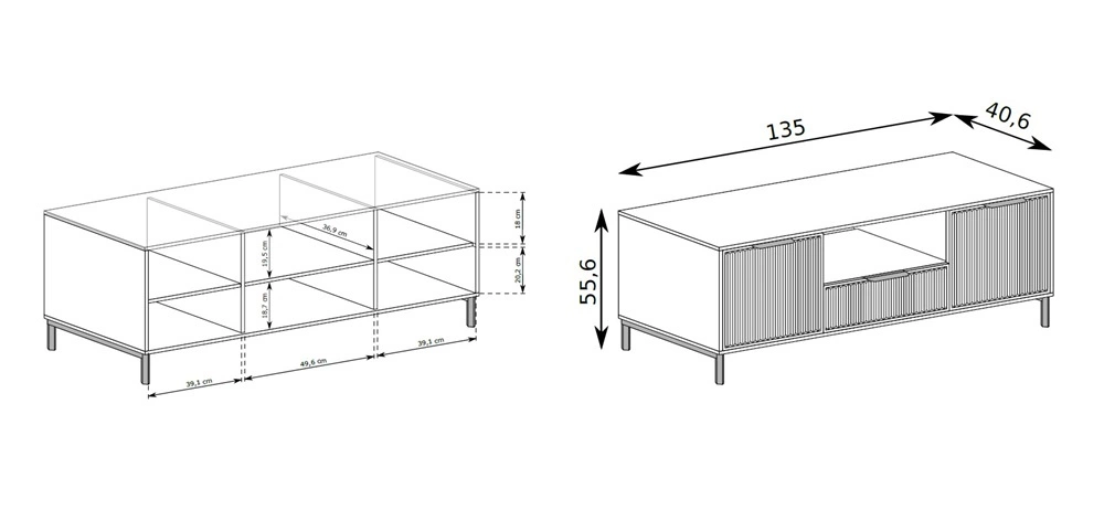 - Zestaw mebli Linka to bardzo eleganckie i oryginalne bryły. Geometryczny kształt, ryflowane fronty oraz stylowe uchwyty krawędziowe stanowią nietuzinkowe wykończenie mebli. Wysoka podstawa sprawia, że meblościanka prezentuje się bardzo szykownie.
