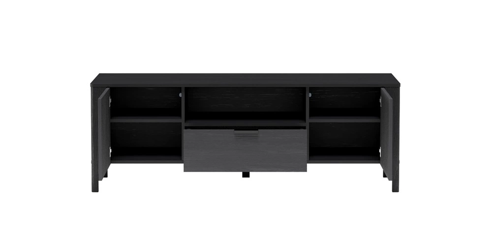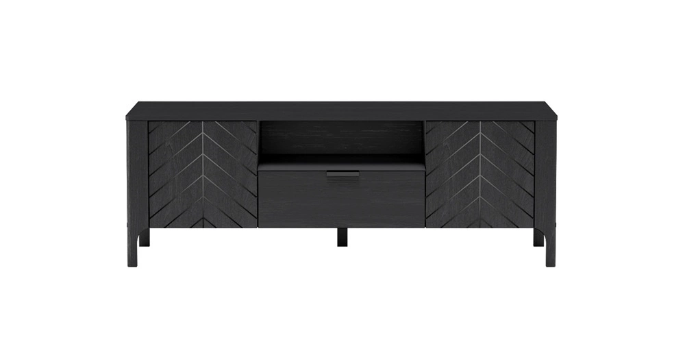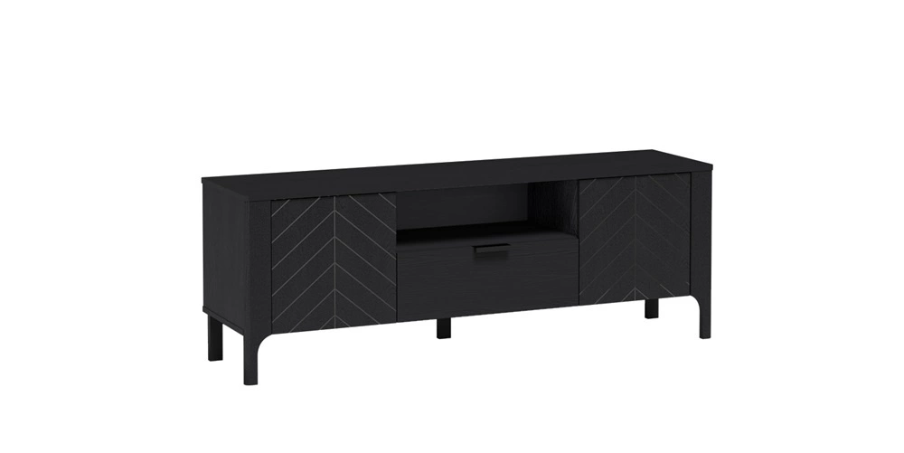 Szafka RTV Malumi 160 cm czarna stylowy design ozdobny wzór jodełki na frontach minimalistyczny metalowy uchwyt wysoka podstawa