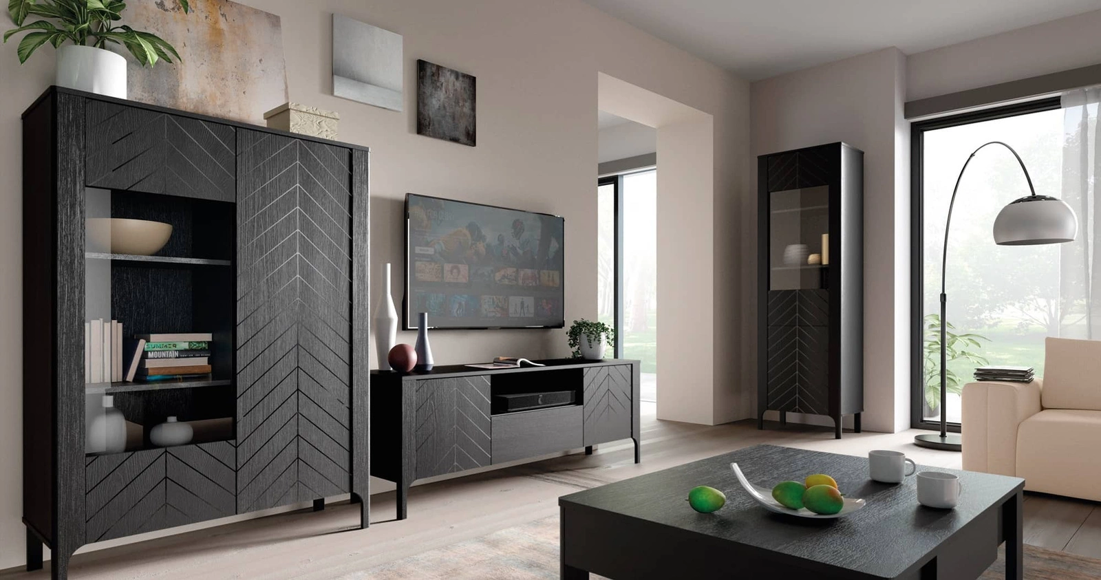 Szafka pod telewizor z kolekcji Malumi to elegancki i funkcjonalny mebel w kolorze głębokiej czerni, która doskonale wpasuje się w nowoczesne wnętrza. Wyrafinowany, subtelny wzór jodełki na frontach mebla w połączeniu z minimalistycznym uchwytem sprawia, że całość prezentuje się bardzo modnie oraz podkreśla stylowy charakter aranżacji. Smukłe, ale solidne nóżki nadają lekkości, a jednocześnie zapewniają stabilność. Szafka RTV Malumi to idealna propozycja zarówno do salonu, jadalni, jak i pokoju dziennego.