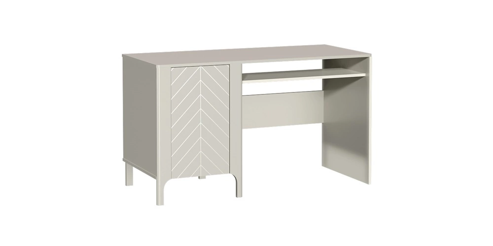 Biurko z kolekcji Malumi to elegancki i funkcjonalny mebel w kolorze beżu o kaszmirowym odcieniu, który doskonale wpasuje się w nowoczesne wnętrza. Wyrafinowany, subtelny wzór jodełki w połączeniu z bezuchwytowym frontem sprawia, że całość prezentuje się bardzo modnie oraz podkreśla stylowy charakter aranżacji. Smukłe, solidna podstawa nadaje lekkości, a jednocześnie zapewniają stabilność. Biurko Malumi to idealna propozycja zarówno do biura, gabinetu, jak i pokoju młodzieżowego.