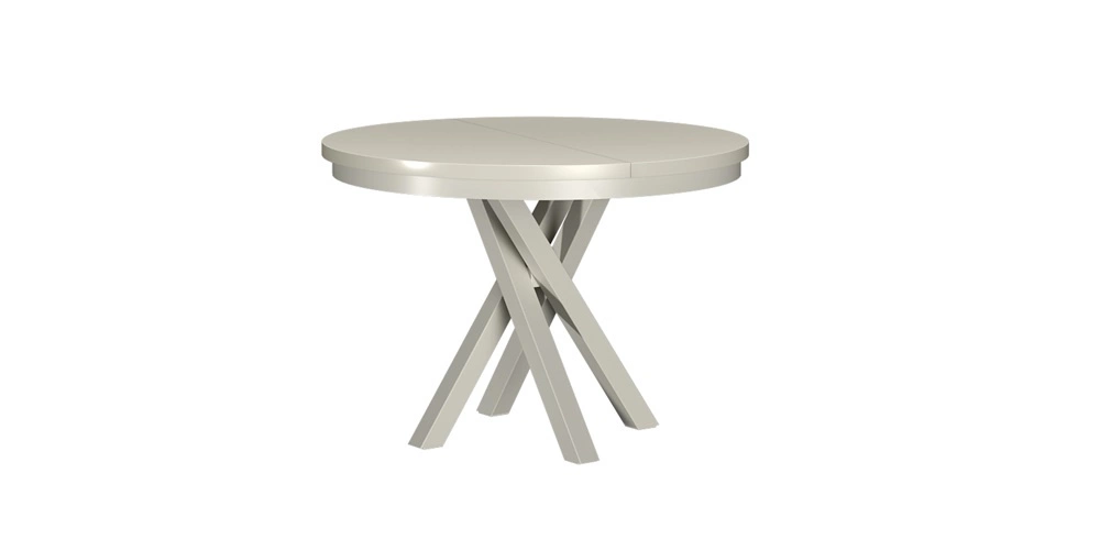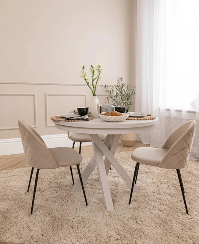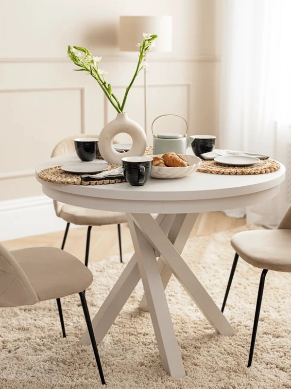 Stół rozkładany z kolekcji Malumi to elegancki i funkcjonalny mebel w kolorze beżu o kaszmirowym odcieniu, który doskonale wpasuje się w nowoczesne wnętrza. Komfortowy, okrągły blat w połączeniu z charakterystycznymi, skrzyżowanymi nogami sprawia, że całość prezentuje się bardzo modnie oraz podkreśla stylowy charakter aranżacji. Możliwość łatwego rozłożenia zapewnia elastyczność oraz wszechstronność użytkowania. Stół okrągły rozkładany to rozwiązanie, które pozwala zaoszczędzić miejsce i jednocześnie być zawsze gotowym na niespodziewanych gości. Stół z kolekcji Malumi stanie się centralnym punktem Twojej jadalni, przyciągając wzrok, a także dodając wnętrzu wyjątkowego charakteru.