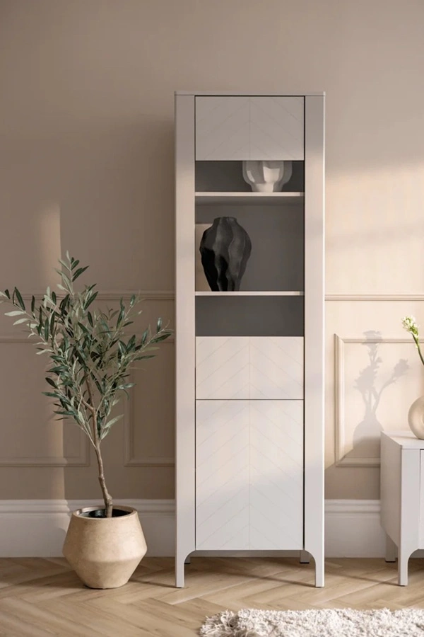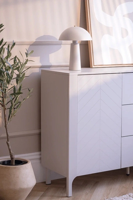 Zestaw mebli Malumi to eleganckie i funkcjonalne bryły w kolorze beżu o kaszmirowym odcieniu, który doskonale wpasują się w nowoczesne wnętrza. Wyrafinowany, subtelny wzór jodełki na frontach mebli w połączeniu z minimalistycznymi uchwytami sprawia, że całość prezentuje się bardzo modnie oraz podkreśla stylowy charakter aranżacji. Smukłe, ale solidne nóżki nadają lekkości, a jednocześnie zapewniają stabilność. Meble Malumi to idealna propozycja zarówno do salonu, sypialni, jak i przedpokoju.