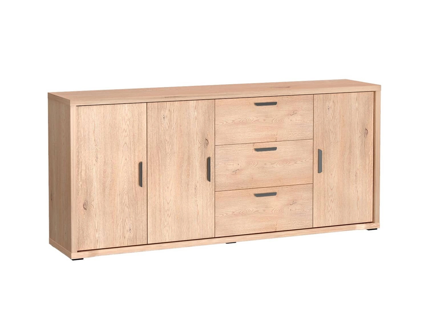 Komoda do salonu skonstruowana jest z 3 drzwi oraz 3 szuflad. Standardowym wyposażeniem są zawiasy oraz prowadnice szuflad z systemem cichego domykania. Zastosowany system zwiększa komfort i bezpieczeństwo użytkowania mebli. Komoda do salonu gwarantuje komfortowe i bezproblemowe korzystanie oraz trwałość całego mebla przez wiele lat użytkowania. Jasny odcień dębu cremona nada pomieszczeniu lekkości i przytulnego klimatu, dzięki czemu komoda z szufladami Grand świetnie sprawdzi się w roli komody do salonu lub komody do pokoju dziennego. Komoda z powodzeniem odnajdzie się także jako mebel biurowy lub komoda do sypialni.