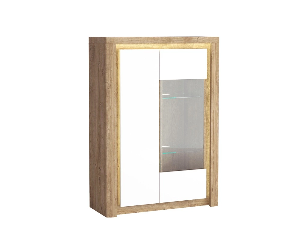 Witryna niska Livinio 100 cm dąb ribbeck / biały połysk estetycznie i starannie wykonana witryna do jadalni podświetlenie ledowe