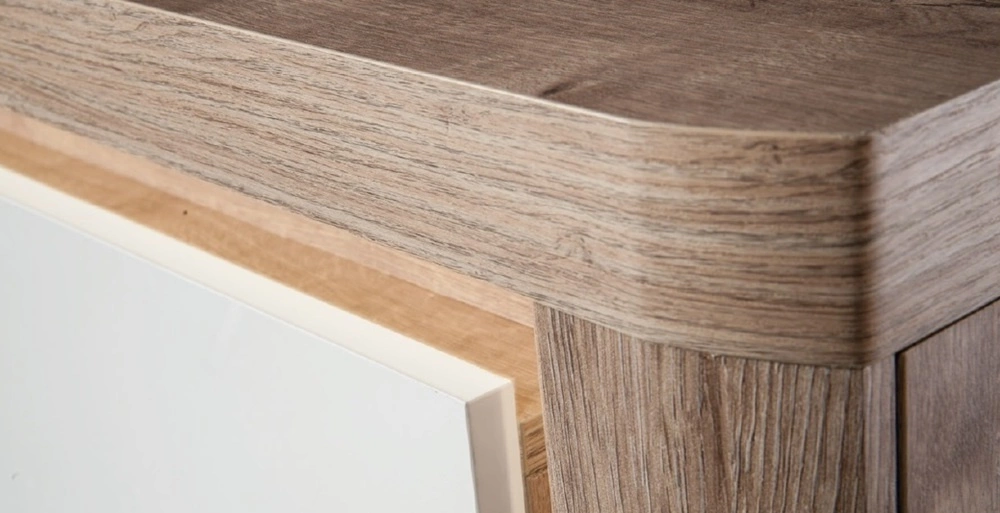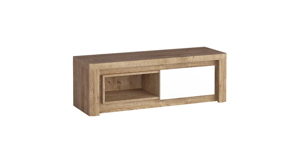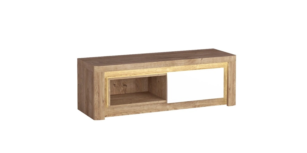 Szafka pod telewizor Livinio to mebel stworzony dla zwolenników ciepłych i lekkich aranżacji połączonych z nutą nowoczesności. Połączenie bieli z dębem ribbeck stworzy niesamowite i niepowtarzalne wnętrze. Głównym elementem przyciągającym wzrok jest delikatnie zaoblony kształt korpusu, gładkie fronty wykończone w połysku, które uwydatnia subtelne oświetlenie LED. Niepowtarzalność oraz funkcjonalność szafki RTV Livinio decyduje o mnogości zastosowań aranżacyjnych, od nowoczesnych przestrzeni po te urządzone w stylu klasycznym.