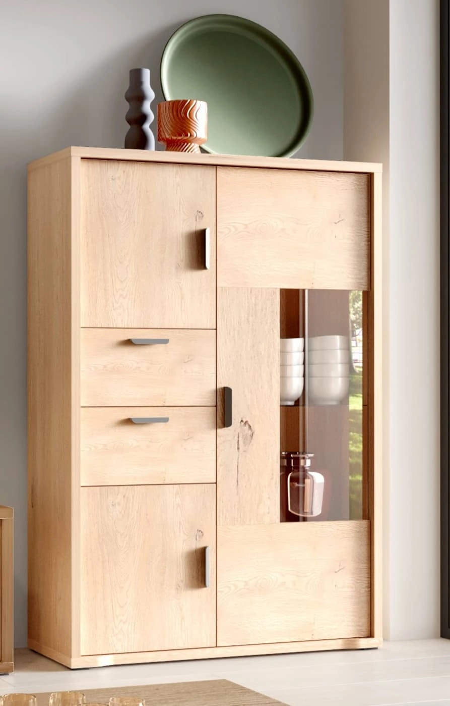 - Witryna szeroka Grand to idealna propozycja dla osób ceniących nowoczesne aranżacje. Kolor jasnego drewna, wzbogacony subtelnymi uchwytami doskonale współgra z minimalistyczną formą bryły. Zaoblone detale bryły dodają witrynie lekkości.