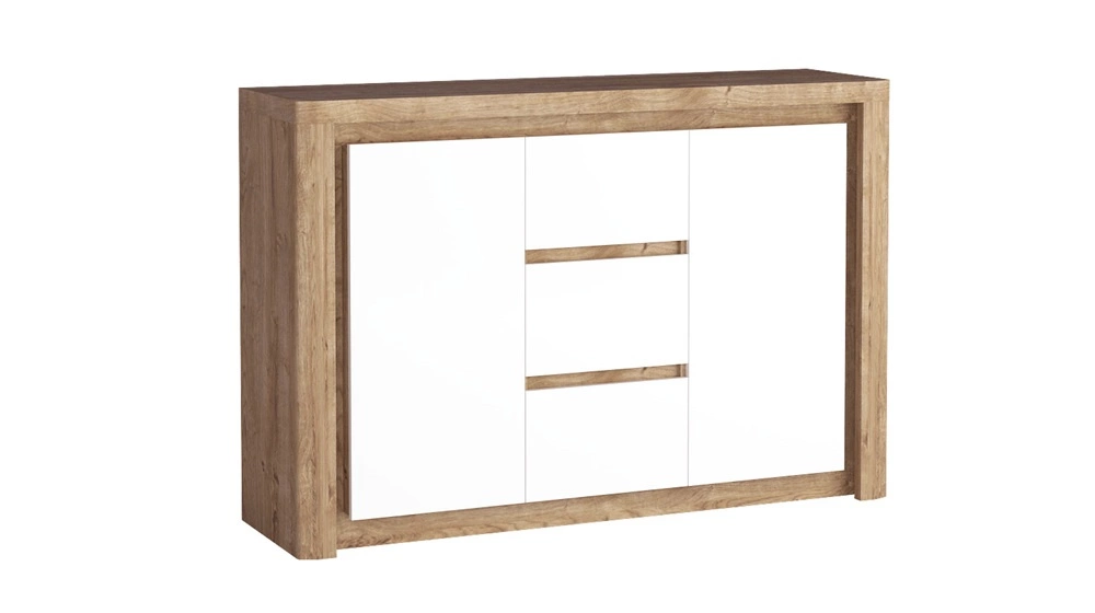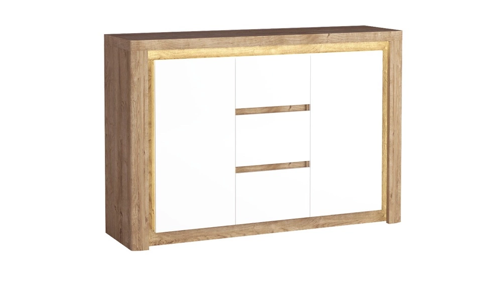Meble do salonu Livinio to bryły stworzone dla zwolenników ciepłych i lekkich aranżacji połączonych z nutą nowoczesności. Połączenie bieli z dębem ribbeck stworzy niesamowite i niepowtarzalne wnętrze. Głównym elementem przyciągającym wzrok jest delikatnie zaoblony kształt korpusu, gładkie fronty wykończone w połysku, które uwydatnia subtelne oświetlenie LED. Niepowtarzalność oraz funkcjonalność meblościanki Livinio decyduje o mnogości zastosowań aranżacyjnych, od nowoczesnych przestrzeni po te urządzone w stylu klasycznym.