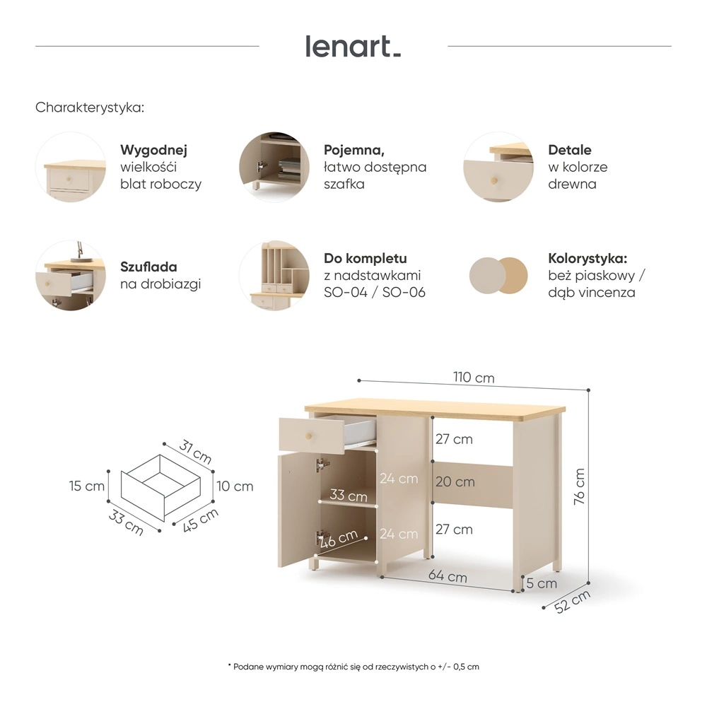 • Biurko Story to elegancka i łatwa w aranżacji bryła pasująca do różnych stylów wykończenia wnętrza dla dzieci i młodzieży. Połączenie beżu w piaskowym odcieniu z dębem vincenza oraz gładkie fronty z charakterystycznymi ramami nadają nieco oryginalności.