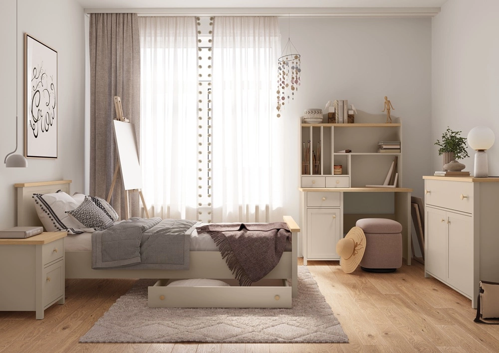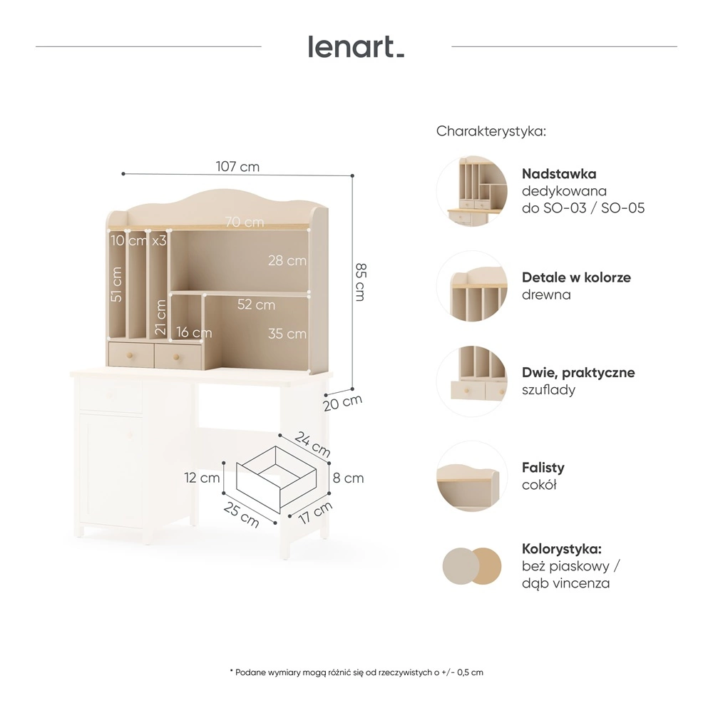 Nadstawka do biurka Story w formie sekretarzyka to elegancka i bardzo łatwa w aranżacji bryła pasująca do różnych stylów wykończenia wnętrza dla dzieci i młodziezy. Subtelne połączenie beżu w piaskowym odcieniu z dębem vincenza stworzy estetyczne i niezwykle ciepłe wnętrze, idealnie wpisujące się w gust każdego młodszego lub nieco starszego dziecka. Delikatna i miękka linia wykończenia nadaje kolekcji Story nieco oryginalności. Oprócz aspektów wizualnych sekretarzyk oferuje dużo miejsca do przechowywania oraz możliwość praktycznego uporządkowania kredek, długopisów, zeszytów i innych dziewczęcych drobiazgów.