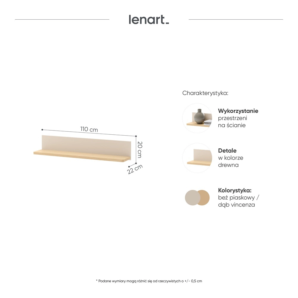 - Półka wisząca Story to estetyczna i bardzo łatwa w aranżacji bryła pasująca do różnych stylów wykończenia wnętrza dla dzieci. Subtelne połączenie beżu w piaskowym odcieniu z dębem vincenza doskonale oddaje elegancki charakter półki.