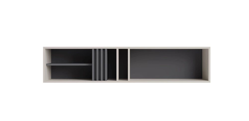Półka jest idealnym wyborem dla miłośników nowoczesnych aranżacji o eleganckim charakterze, dla których ważna jest również szeroka funkcjonalność mebla. Konstrukcja półki w beżowym kolorze o kaszmirowym odcieniu zostały przełamane stylowymi lamelkami w kolorze antracytu.
