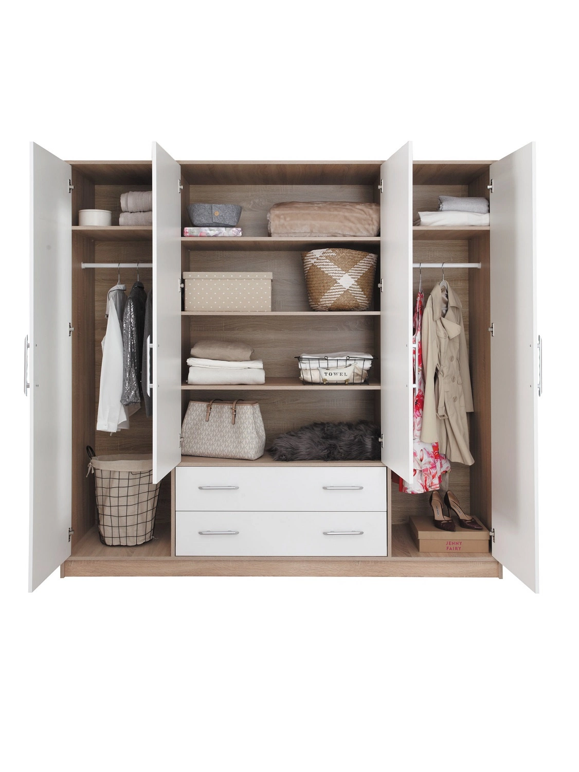 Szafa na ubrania dzieli się na części z drążkami i część z półkami. Do wysuwania szuflad zastosowano niezawodne prowadnice rolkowe. Caspe świetnie sprawdzi się w roli szafy do sypialni czy szafy do przedpokoju.