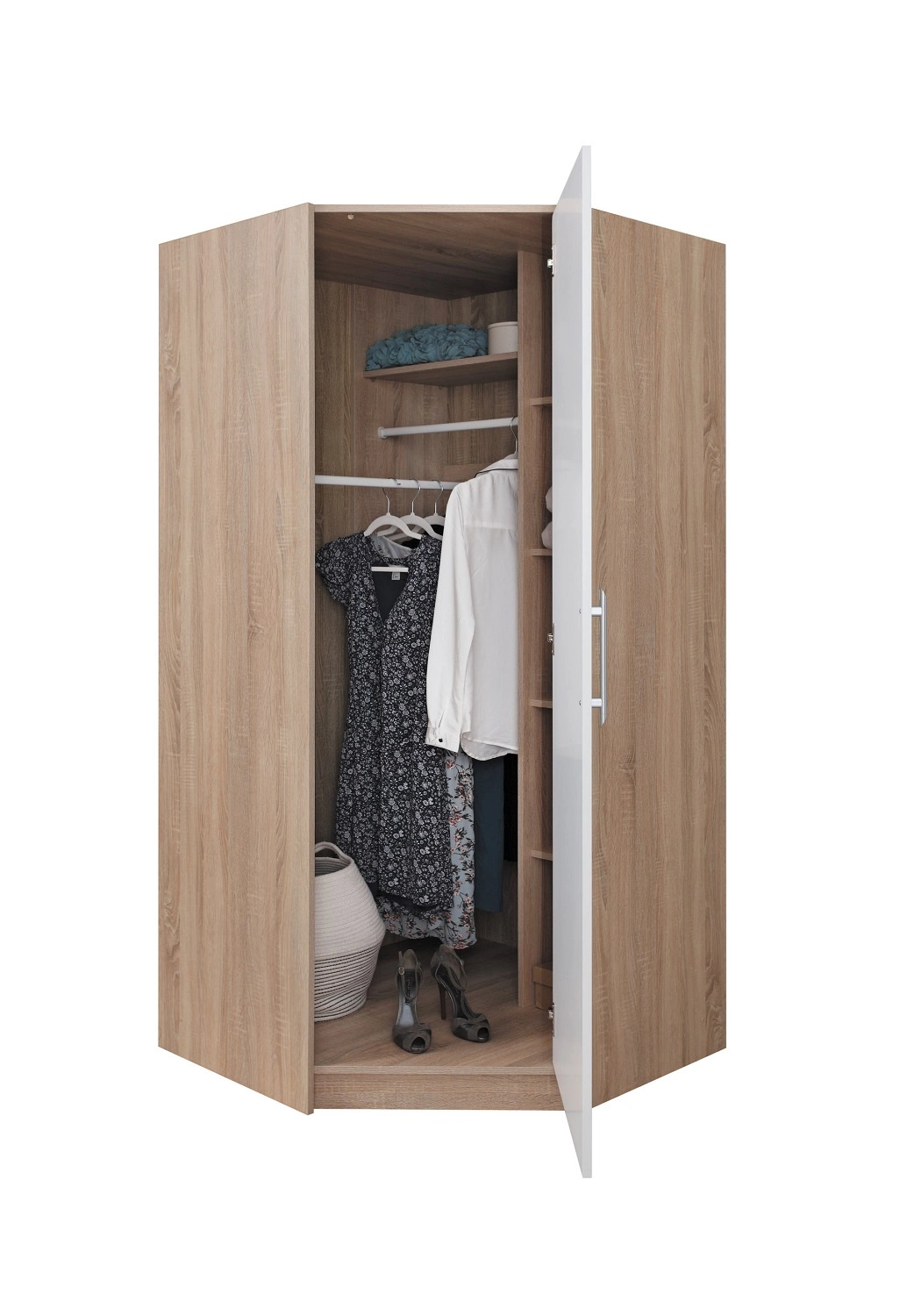 - Szafa narożna Caspe to przepis na ergonomiczne oraz funkcjonalne wnętrze. Prosta forma i geometryczne kształty szafy na ubrania doskonale odzwierciedlają współczesne trendy. Sprawdzi się w sypialni, pokoju dziennym, garderobie i przedpokoju.